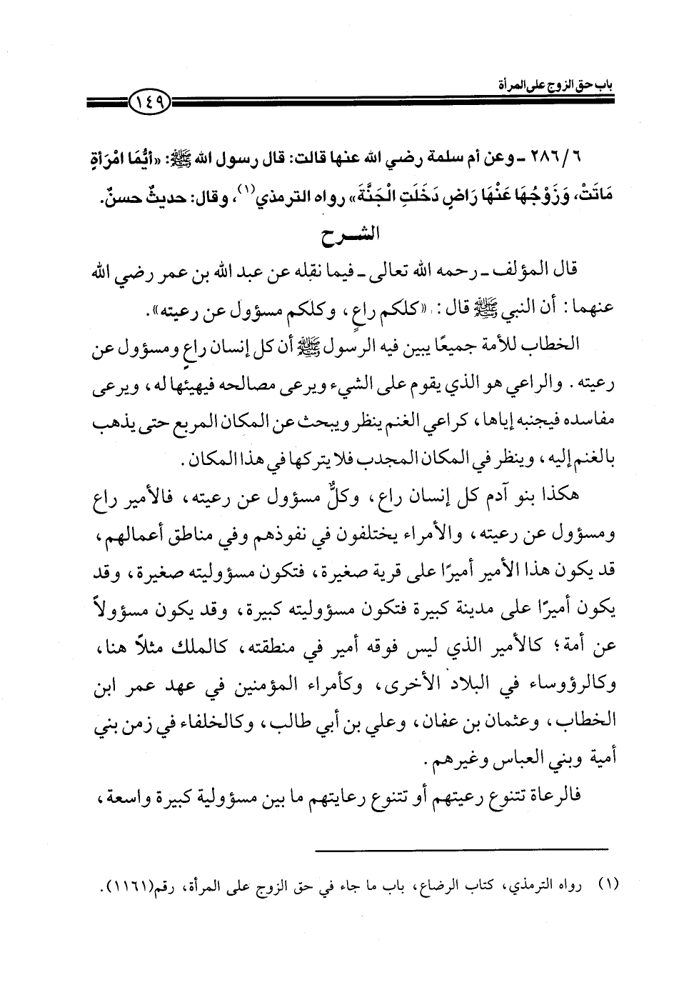 EXقال المؤلف ـ رحمه الله تعالى ـ فيما نقله عن عبد الله بن عمر رضي الله عنهما أن النبي صلى الله عليه وسلم قال: ((كلكم راع، وكلكم مسؤول عن رعيته)) .
