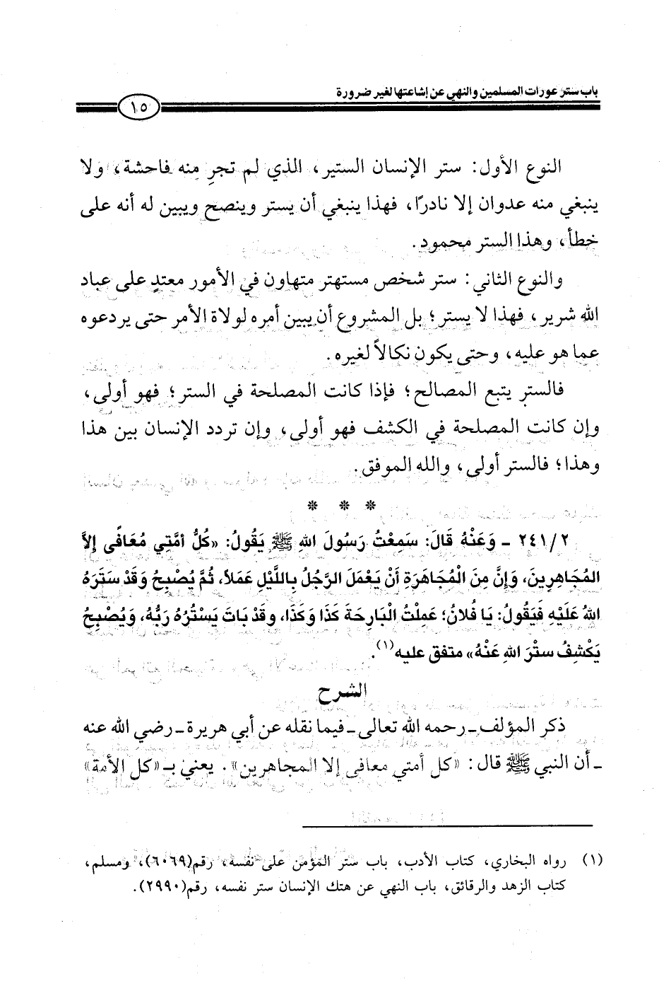 2/241 ـ وعنه قال سمعت رسول الله صلى الله عليه وسلم يقول: ((كل أمتي معافى إلا المجاهرين وإن من المجاهرة أن يعمل الرجل بالليل عملاً، ثم يصبح وقد ستره الله عليه فيقول: يا فلان عملت البارحة كذا كذا، وقد بات يستره ربه ويصبح يكشف ستر الله عنه)) متفق عليه.