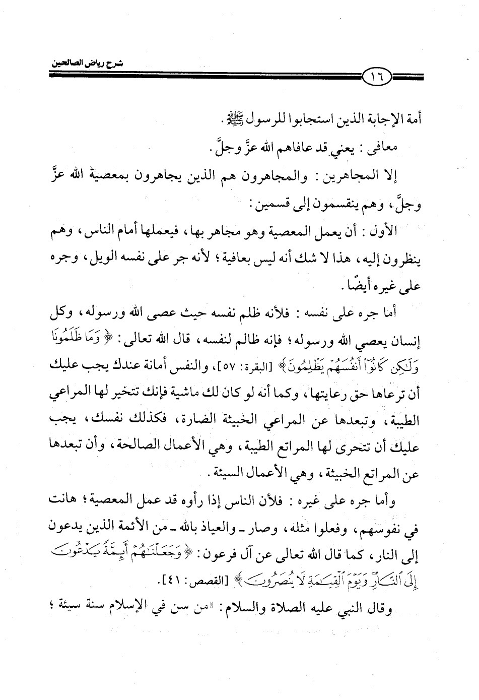 وأما جره على غيره: فلأن الناس إذا رأوه قد عمل المعصية؛ هانت في نفوسهم، وفعلوا مثله، وصار ـ والعياذ بالله ـ من الأئمة الذين يدعون إلى النار، كما قال الله تعالى عن آل فرعون: (وَجَعَلْنَاهُمْ أَئِمَّةً يَدْعُونَ إِلَى النَّارِ وَيَوْمَ الْقِيَامَةِ لا يُنْصَرُونَ) [القصص: 41] .