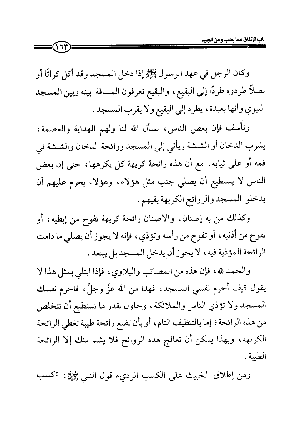 ونأسف فإن بعض الناس، نسأل الله لنا ولهم الهداية والعصمة، يشرب الدخان أو الشيشة ويأتي إلى المسجد ورائحة الدخان والشيشة في فمه أو على ثيابه، مع أن هذه رائحة كريهة كلٌ يكرهها، حتى إن بعض الناس لا يستطيع أن يصلي جنب مثل هؤلاء، وهؤلاء يحرم عليهم أن يدخلوا المسجد والروائح الكريهة بفيهم.