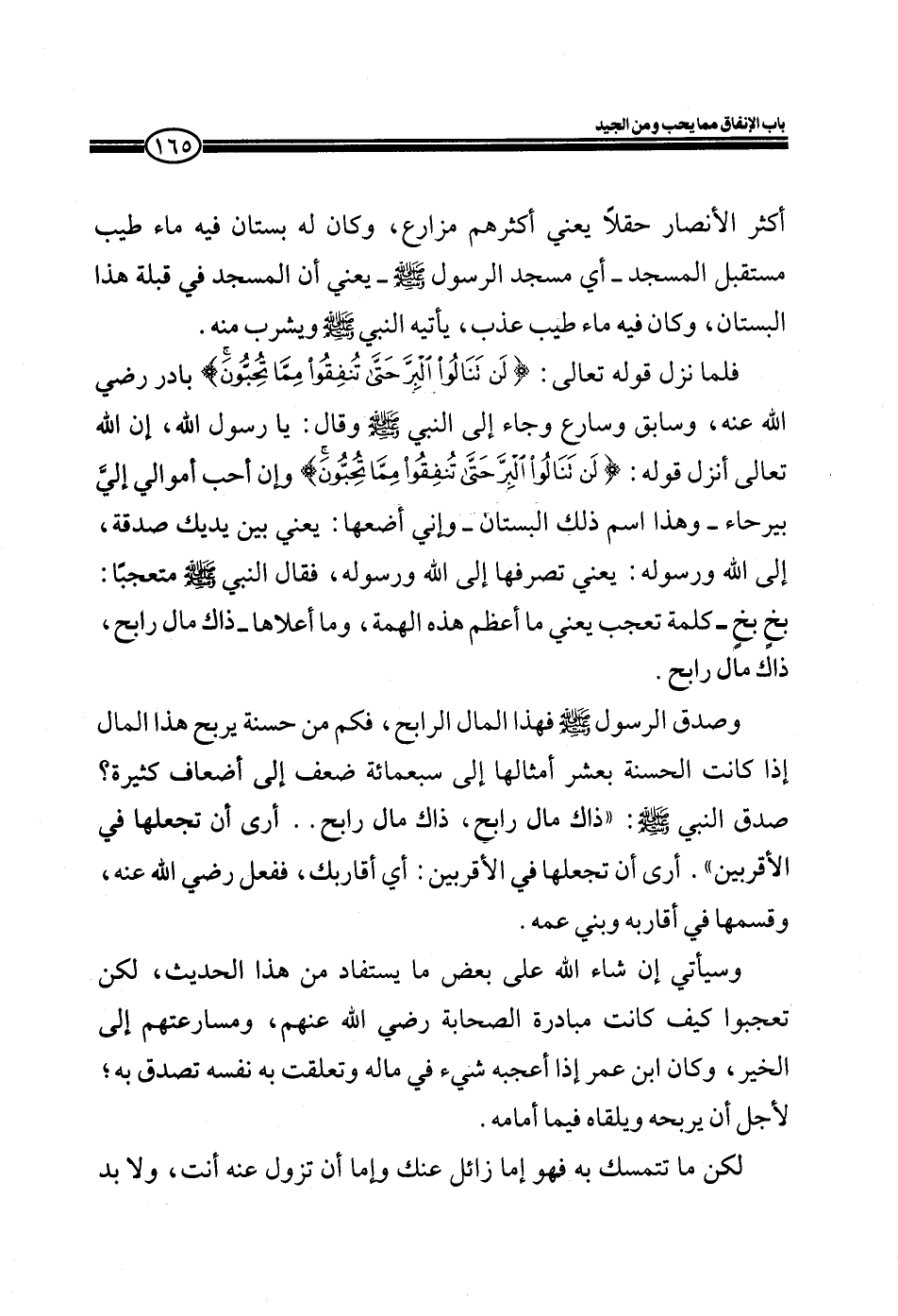 فلما نزل قوله تعالى: (لَنْ تَنَالُوا الْبِرَّ حَتَّى تُنْفِقُوا مِمَّا تُحِبُّونَ) بادر رضي الله عنه، وسابق وسارع وجاء إلى النبي صلى الله عليه وسلم وقال: يا رسول الله، إن الله تعالى أنزل قوله: (لَنْ تَنَالُوا الْبِرَّ حَتَّى تُنْفِقُوا مِمَّا تُحِبُّونَ) وإن أحب أموالي إلي بيرحاء ـ وهذا اسم ذلك البستان ـ وإني أضعها: يعني بين يديك صدقة، إلى الله ورسوله: يعني تصرفها إلى الله ورسوله فقال النبي صلى الله عليه وسلم متعجباً: بخٍ بخٍ ـ كلمة تعجب يعني ما أعظم هذه الهمة، وما أعلاها ـ ذاك مال رابح، ذاك مال رابح.