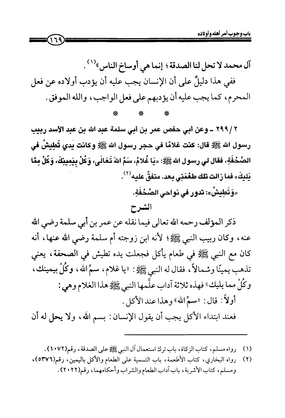 2/299 ـ وعن أبي حفص عمر بن أبي سلمة عبد الله بن عبد الأسد ربيب رسول الله صلى الله عليه وسلم قال: كنت غلاماً في حجر رسول الله صلى الله عليه وسلم وكانت يدي تطيش في الصحفة فقال لي رسول الله صلى الله عليه وسلم ((يا غلام، سمّ الله تعالى، وكل بيمينك، وكل مما يليك)) فما زالت تلك طعمتي بعد. متفق عليه.