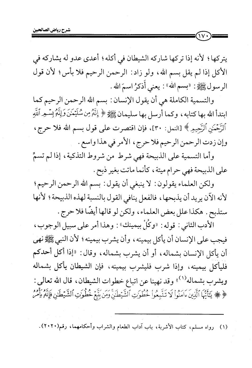 الأدب الثاني: قوله: ((وكل بيمينك)) : وهذا أمر على سبيل الوجوب، فيجب على الإنسان أن يأكل بيمينه وأن يشرب بيمينه؛ لأن النبي صلى الله عليه وسلم نهى أن يأكل الإنسان بشماله، أو أن يشرب بشماله، وقال: ((إذا أكل أحدكم فليأكل بيمينه، وإذا شرب فليشرب بيمينه، فإن الشيطان يأكل بشماله ويشرب بشماله)) وقد نهينا عن اتباع خطوات الشيطان، قال الله تعالى: (يَا أَيُّهَا الَّذِينَ آمَنُوا لا تَتَّبِعُوا خُطُوَاتِ الشَّيْطَانِ وَمَنْ يَتَّبِعْ خُطُوَاتِ الشَّيْطَانِ فَإِنَّهُ يَأْمُرُ
