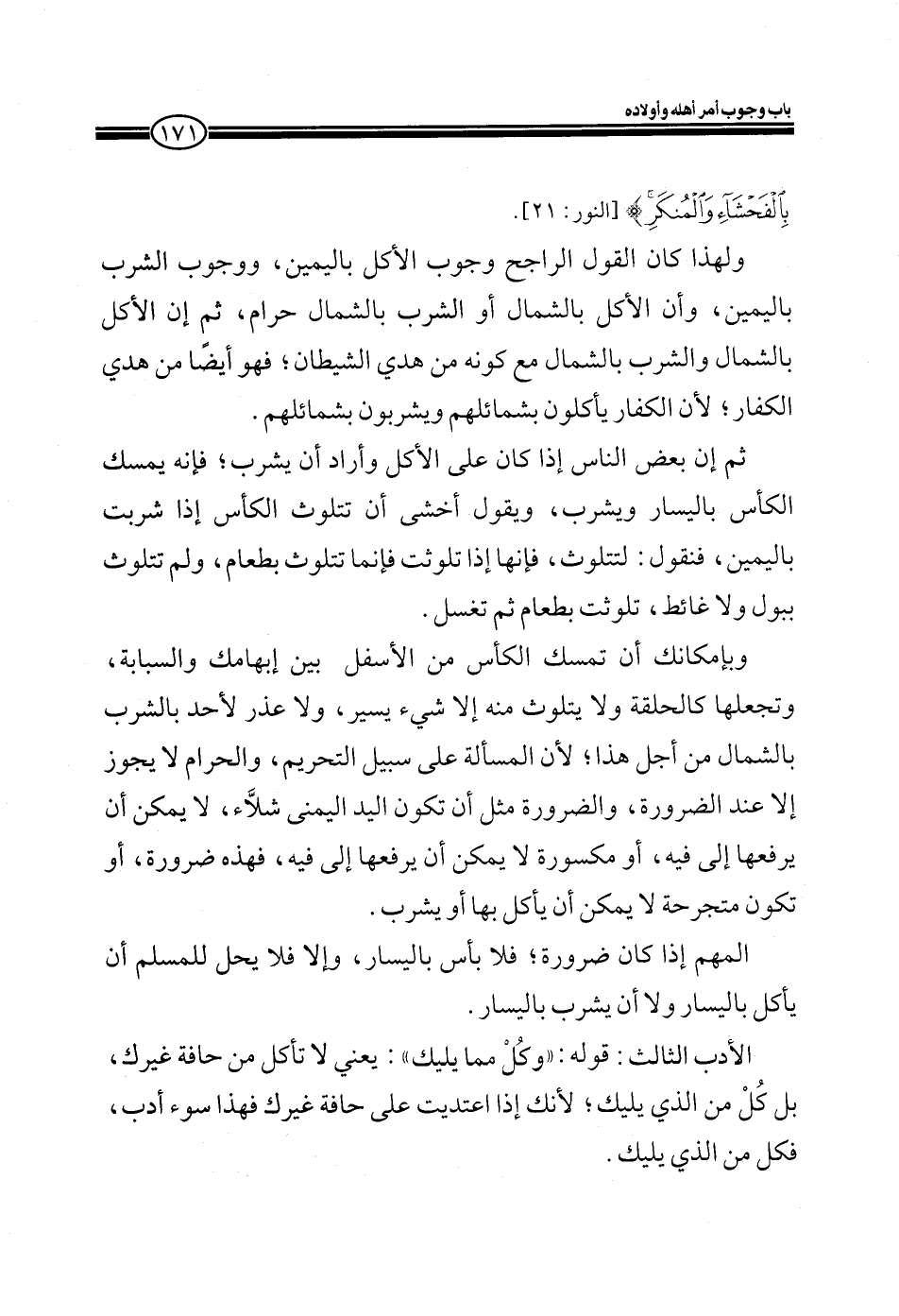 ولهذا كان القول الراجح وجوب الأكل باليمين، ووجوب الشرب باليمين، وأن الأكل بالشمال أو الشرب بالشمال حرام، ثم إن الأكل بالشمال والشرب بالشمال مع كونه من هدي الشيطان؛ فهو أيضاً من هدي الكفار؛ لأن الكفار يأكلون بشمائلهم ويشربون بشمائلهم.