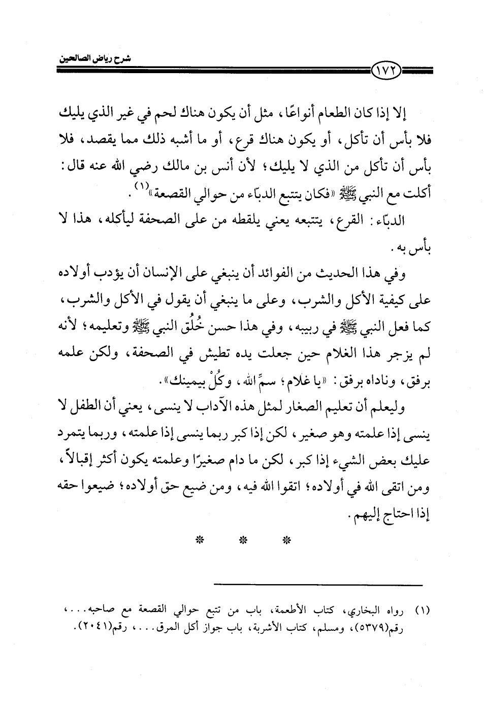 وفي هذا الحديث من الفوائد أن ينبغي على الإنسان أن يؤدب أولاده على كيفية الأكل والشرب، وعلى ما ينبغي أن يقول في الأكل والشرب، كما فعل النبي صلى الله عليه وسلم في ربيبه، وفي هذا حسن خلق النبي صلى الله عليه وسلم وتعليمه؛ لأنه لم يزجر هذا الغلام حين جعلت يده في الصحفة، ولكن علمه برفق، وناداه برفق: ((يا غلام؛ سمِّ الله، وكل بيمينك)) .