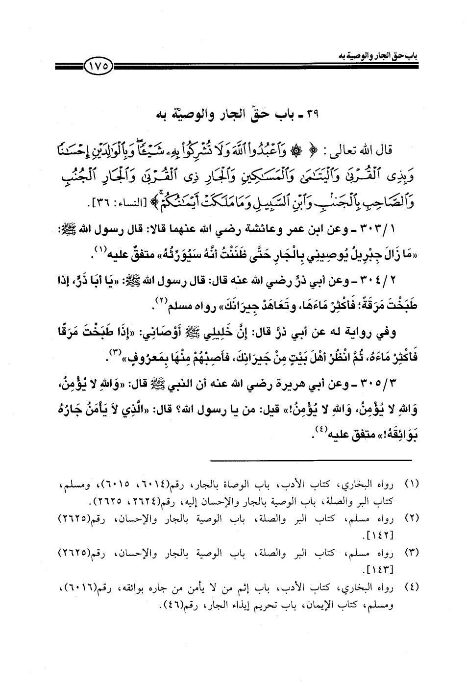 1/303 ـ وعن ابن عمر وعائشة رضي الله عنهما قالا: قال رسول الله صلى الله عليه وسلم ((ما زال جبريل يوصيني بالجار حتى ظننت أنه سيورثه)) متفق عليه.