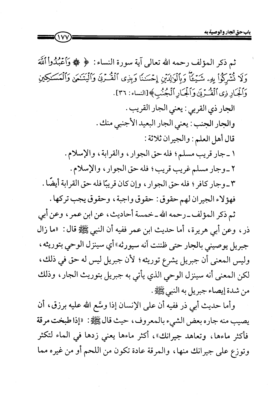 ثم ذكر المؤلف رحمه الله تعالى آية سورة النساء: (وَاعْبُدُوا اللَّهَ وَلا تُشْرِكُوا بِهِ شَيْئاً وَبِالْوَالِدَيْنِ إِحْسَاناً وَبِذِي الْقُرْبَى وَالْيَتَامَى وَالْمَسَاكِينِ وَالْجَارِ ذِي الْقُرْبَى وَالْجَارِ الْجُنُبِ) [النساء: 36] .