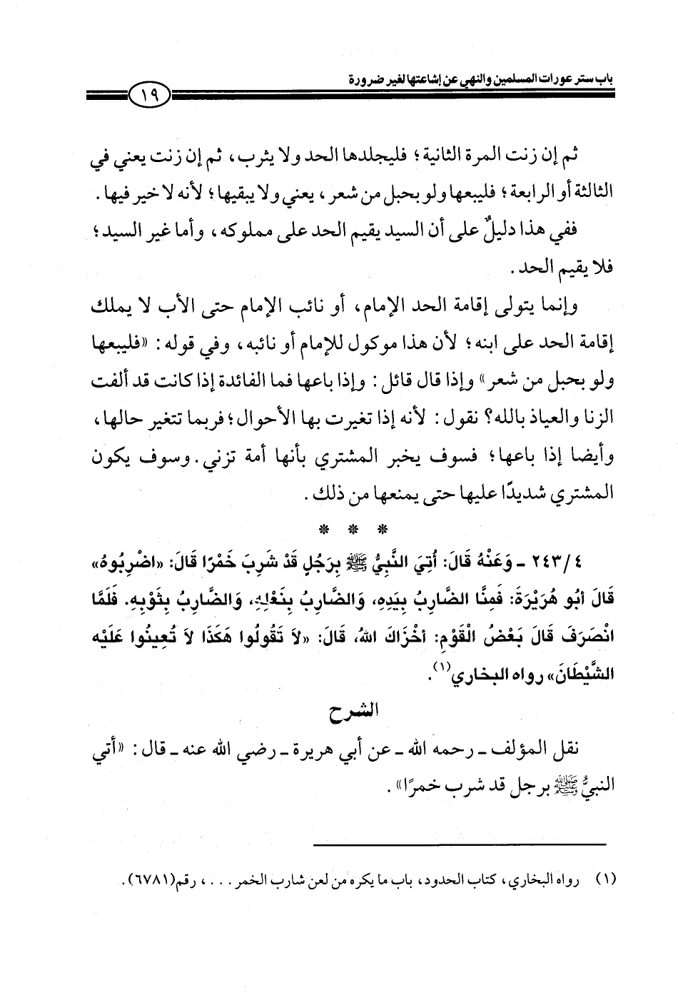 4/243 ـ وعنه قال: أتي النبي صلى الله عليه وسلم برجل قد شرب خمراً قال: ((اضربوه)) قال أبو هريرة فمنا الضارب بيده، والضارب بنعله، والضارب بثوبه، فلما انصرف قال بعض القوم: أخزاك الله قال: ((لا تقولوا هكذا لا تعينوا عليه الشيطان)) رواه البخاري.