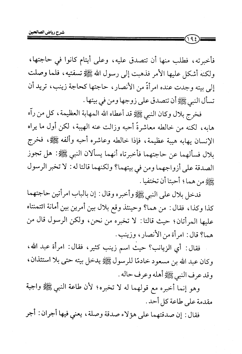 فأخبرته، فطلب منها أن تتصدق عليه، وعلى أيتام كانوا في حاجتها، ولكنه أشكل عليها الأمر فذهبت إلى رسول الله صلى الله عليه وسلم تستفتيه، فلما وصلت إلى بيته وجدت عنده امرأة من الأنصار، حاجتها كحاجة زينب، تريد أن تسأل النبي صلى الله عليه وسلم أن تتصدق على زوجها ومن في بيتها.
