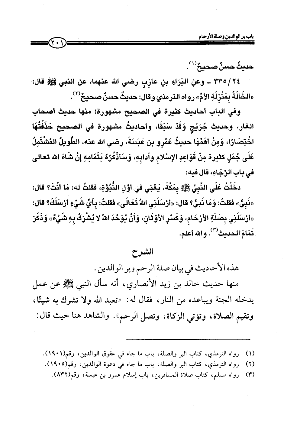24/335 ـ وعن البراء بن عازب رضي الله عنهما، عن النبي صلى الله عليه وسلم قال ((الخالة بمنزلة الأم)) رواه الترمذي وقال: حديث حسن صحيح.