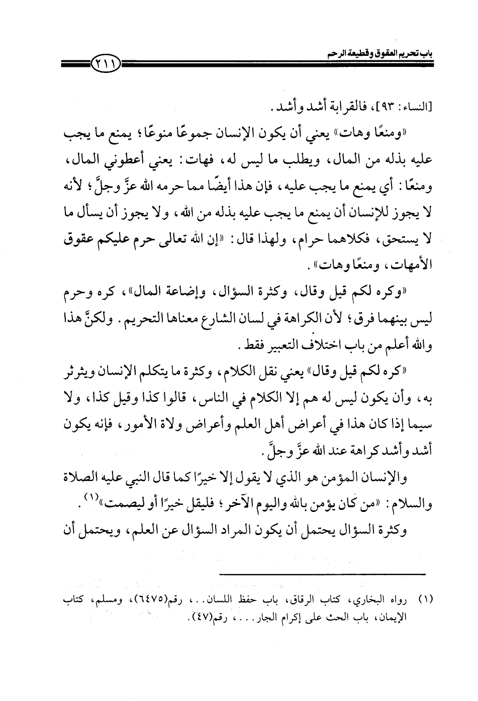 ((ومنعاً وهات)) يعني أن يكون الإنسان جموعاً منوعاً؛ يمنع ما يجب عليه بذله من المال، ويطلب ما ليس له، فهات: يعني أعطوني المال، ومنعاً: أي يمنع ما يجب عليه، فإن هذا أيضاً مما حرمه الله عز وجل؛ لأنه لا يجوز للإنسان أن يمنع ما يجب عليه بذله من الله، ولا يجوز أن يسأل ما لا يستحق، فكلاهما حرام، لهذا قال: ((إن الله تعالى حرم عليكم عقوق الأمهات، ومنعاً وهات)) .