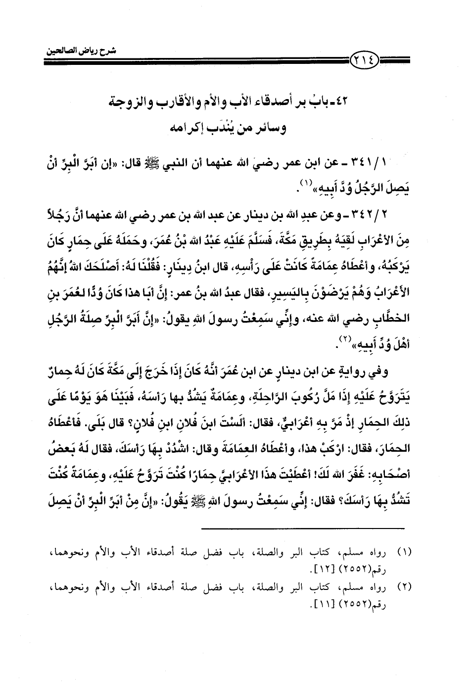 2/342 ـ وعن عبد الله ين دينار عن عبد الله بن عمر رضي الله عنهما أن رجلاً من الأعراب لقيه بطريق مكة، فسلم عليه عبد الله بن عمر، وحمله على حمارٍ كان يركبه، وأعطاه عمامة كانت على رأسه، قال ابن دينار: فقلنا له أصلحك الله إنهم الأعراب وهم يرضون باليسير، فقال عبد الله بن عمر: إن أبا هذا كان وداً لعمر بن الخطاب رضي الله عنه، وإني سمعت رسول الله يقول: ((إن أبر البر صلة الرجل أهل ود أبيه))