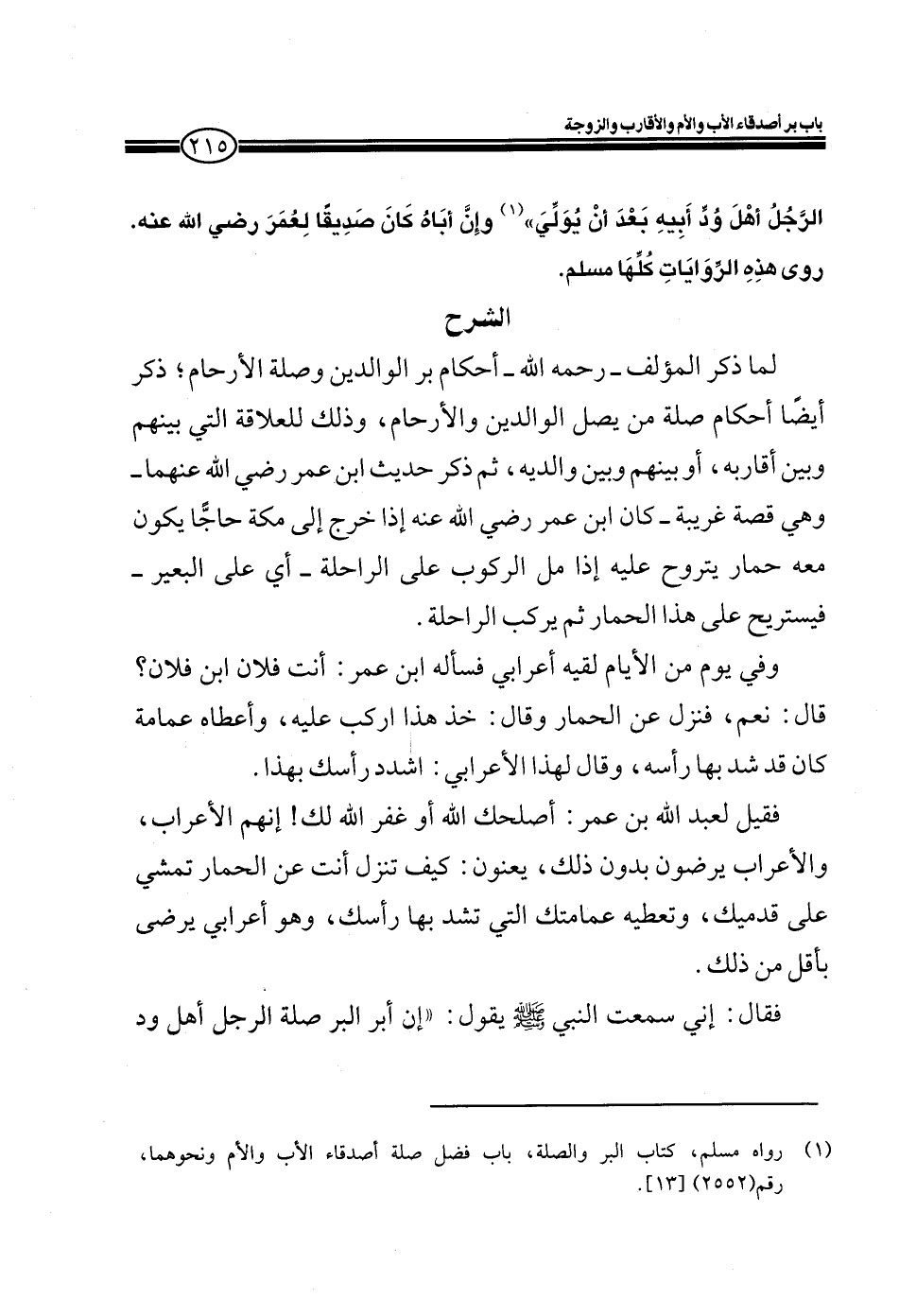EXلما ذكر المؤلف رحمه الله ـ أحكام بر الوالدين وصلة الأرحام؛ ذكر أيضاً حكام صلة من يصل الوالدين والأرحام، وذلك للعلاقة التي بينهم وبين أقاربه، أو بينهم وبين والديه، ثم ذكر حديث ابن عمر رضي الله عنهما ـ وهي قصة غريبة ـ كان ابن عمر رضي الله عنه إذا خرج إلى مكة حاجاً يكون معه حمار يتروح عليه إذا مل الركوب على الراحلة ـ أي البعير ـ فيستريح على هذا الحمار ثم يركب الراحلة.