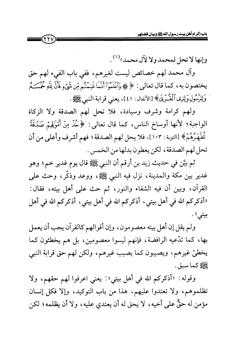 ولم يقل إن أهل بيته معصومون، وإن أقوالهم كالقرآن يجب أن يعمل بها، كما تدعيه الرافضة، فإنهم ليسوا معصومين، بل هم يخطئون كما يخطئ غيرهم، ويصيبون كما يصيب غيرهم، ولكن لهم حق قرابة النبي صلى الله عليه وسلم كما سبق.