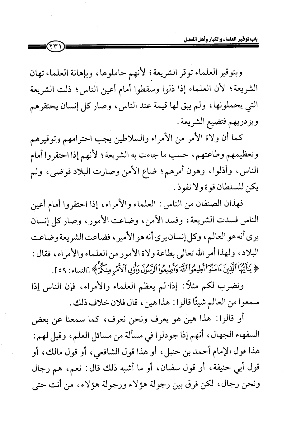 فهذان الصنفان من الناس: العلماء والأمراء، إذا احتقروا أمام أعين الناس فسدت الشريعة، وفسدت الأمن، وضاعت الأمور، وصار كل إنسان يرى أنه هو العالم، وكل إنسان يرى لأنه هو الأمير، فضاعت الشريعة وضاعت البلاد، ولهذا أمر الله تعالى بطاعة ولاة الأمور من العلماء والأمراء فقال: (يَا أَيُّهَا الَّذِينَ آمَنُوا أَطِيعُوا اللَّهَ وَأَطِيعُوا الرَّسُولَ وَأُولِي الْأَمْرِ مِنْكُمْ) [النساء: 59] .