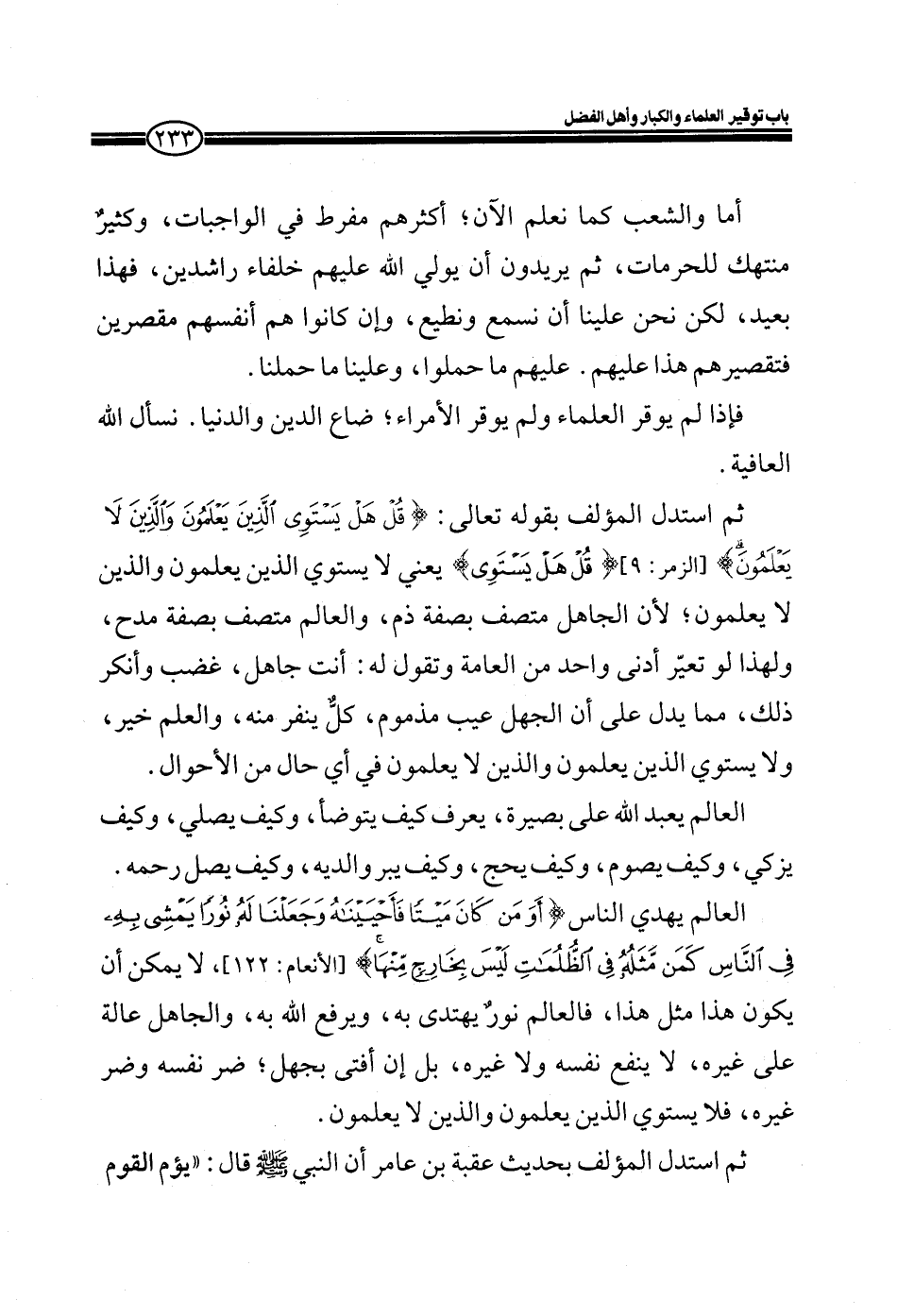 ثم استدل المؤلف بقوله تعالى: (قُلْ هَلْ يَسْتَوِي الَّذِينَ يَعْلَمُونَ وَالَّذِينَ لا يَعْلَمُونَ) [الزمر: 9] (قُلْ هَلْ يَسْتَوِي) يعني لا يستوي الذين يعملون والذين لا يعملون؛ لأن الجاهل متصف بصفة ذم، والعالم متصف بصفة مدح، ولهذا لو تعير أدنى واحد من العامة وتقول له: أنت جاهل، غضب وأنكر ذلك، مما يدل على أن الجهل عيب مذموم، كلُ ينفر منه، والعلم خير، ولا يستوي الذين يعلمون والذين لا يعلمون في أي حال من الأحوال.