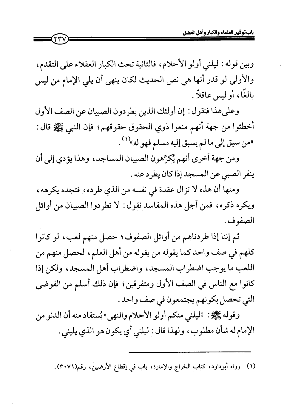 ومنها أن هذه لا تزال عقدة في نفسه من الذي طرده فتجده يكرهه، ويكره ذكره، فمن أجل هذه المفاسد نقول: لا تطردوا الصبيان من أوائل الصفوف.