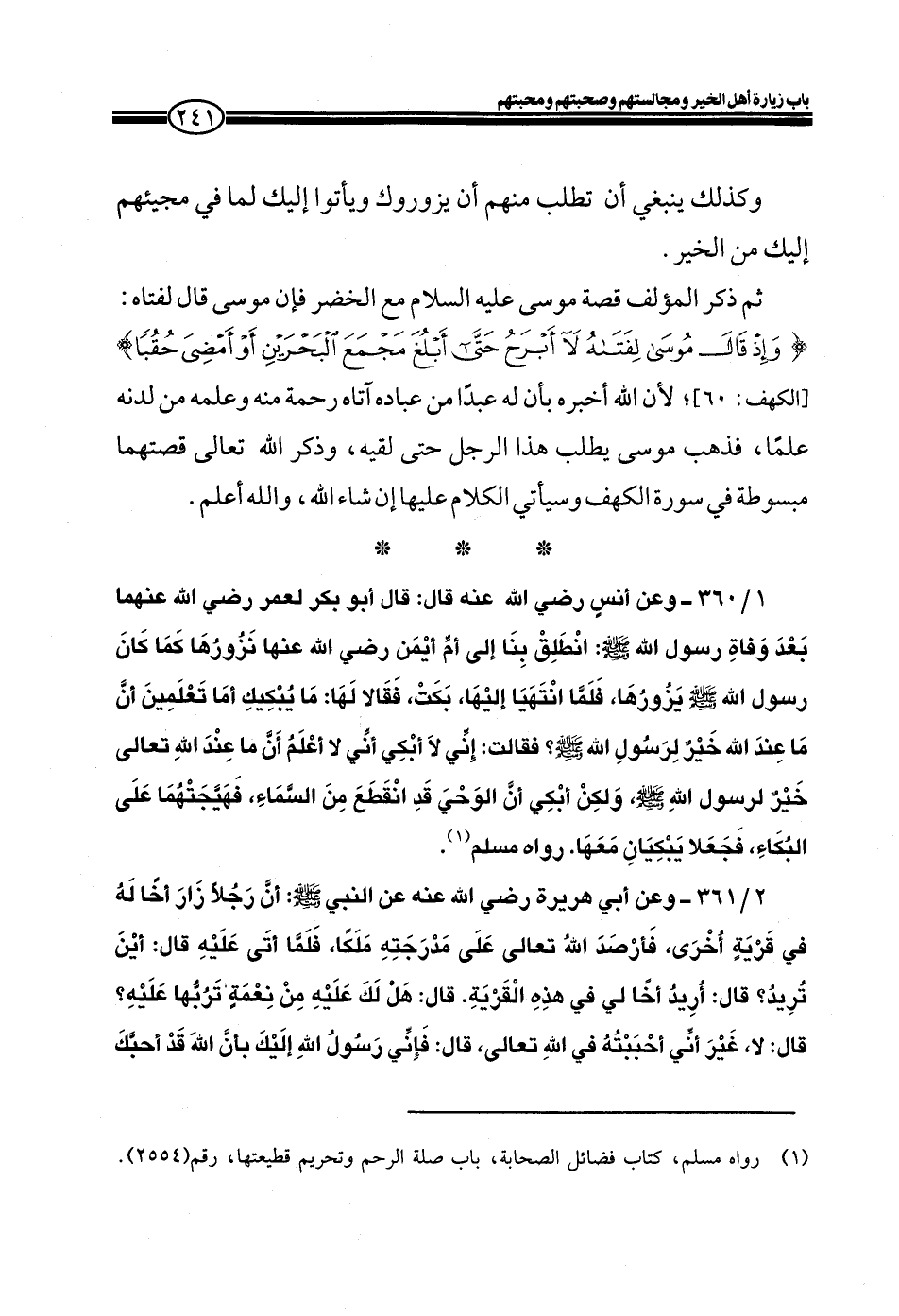 2/361 ـ وعن أبي هريرة رضي الله عنه عن النبي صلى الله عليه وسلم: أن رجلاً زار أخاً له في قرية أخرى، فأرصد الله تعالى على مدرجته ملكاً، فلما أتى عليه قال: أين تريد؟ قال: أريد أخا لي في هذه القرية. قال. هل لك عليه من نعمة تربها عليه؟ قال: لا، غير أنى أحببته في الله تعالى، قال فإني رسول الله إليك بأن الله قد أحبك