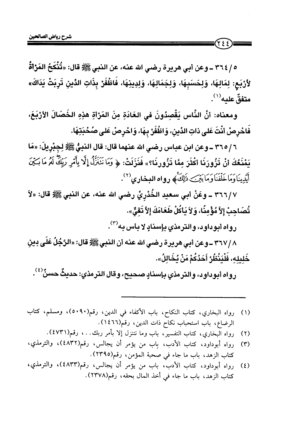 7/366 ـ وعن أبي سعيد الخدري رضي الله عنه، عن النبي صلى الله عليه وسلم قال: ((لا تصاحب إلا مؤمناً، ولا يأكل طعامك إلا تقي)) .