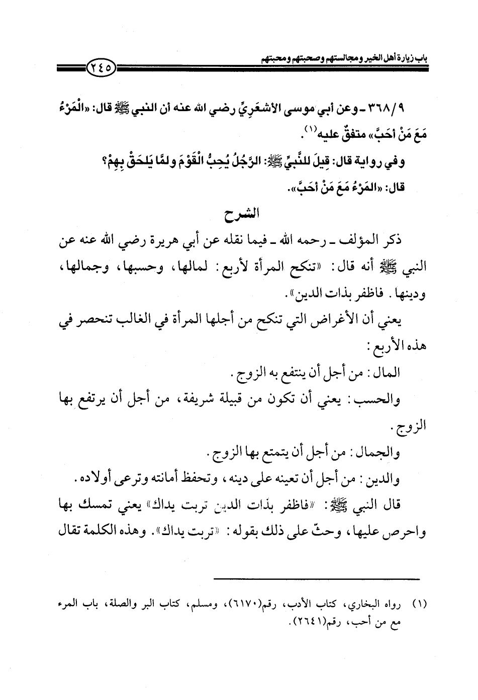 9/368 ـ وعن أبي موسى الأشعري رضى الله عنه أن النبي صلى الله عليه وسلم قال ((المرء مع من أحب)) متفق عليه.