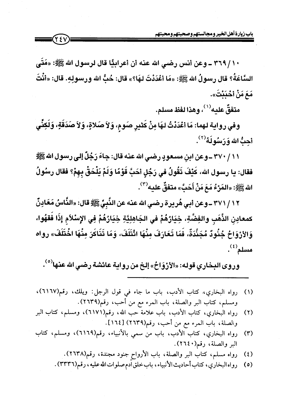 10/369 ـ وعن أنس رضي الله عنه أن أعرابياً قال لرسول الله صلى الله عليه وسلم: ((متى الساعة؟ قال رسول الله صلى الله عليه وسلم: ((ما أعددت لها؟)) قال: حب الله ورسوله. قال: ((أنت مع من أحببت))