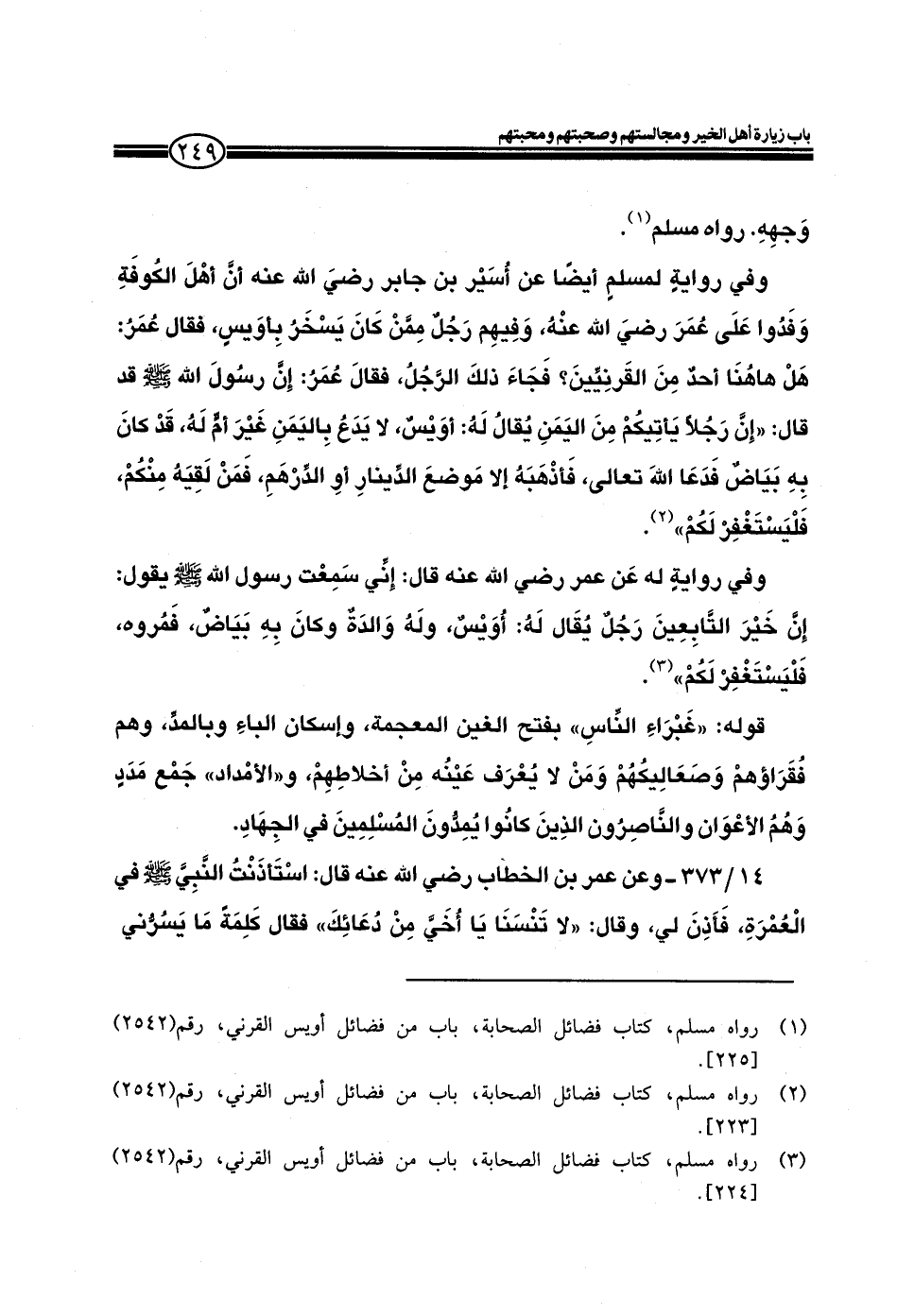 وفي رواية لمسلم أيضاً عن أسير جابر رضي الله عنه أن أهل الكوفة وفدوا على عمر رضي الله عنه، وفيهم رجل ممن كان يسخر بأويس، فقال عمر: هل هاهنا أحد من القربيين؟ فجاء ذلك الرجل، فقال عمر: إن رسول الله صلى الله عليه وسلم قد قال: ((إن رجلاً يأتيكم من اليمن يقال له: أويس، لا يدع باليمن غير أم له، قد كان به بياض فدعا الله تعالى، فأذهبه إلا موضع الدينار أو الدرهم فمن لقيه منكم فليستغفر لكم)) .
