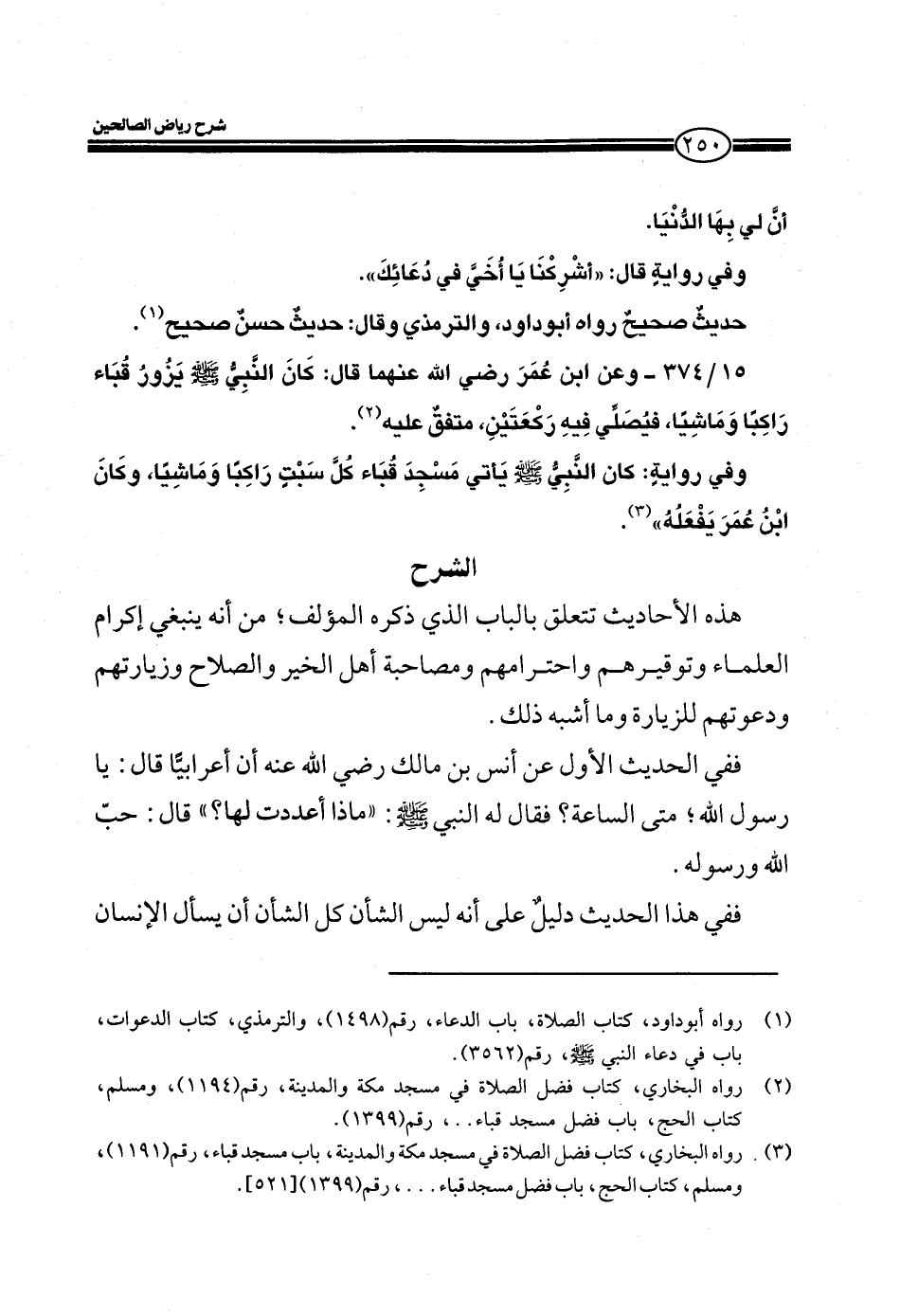15/374 ـ وعن ابن عمر رضي الله عنهما قال: كان النبي صلى الله عليه وسلم يزور قباء راكباً وماشياً، فيصلى فيه ركعتين، متفق عليه.