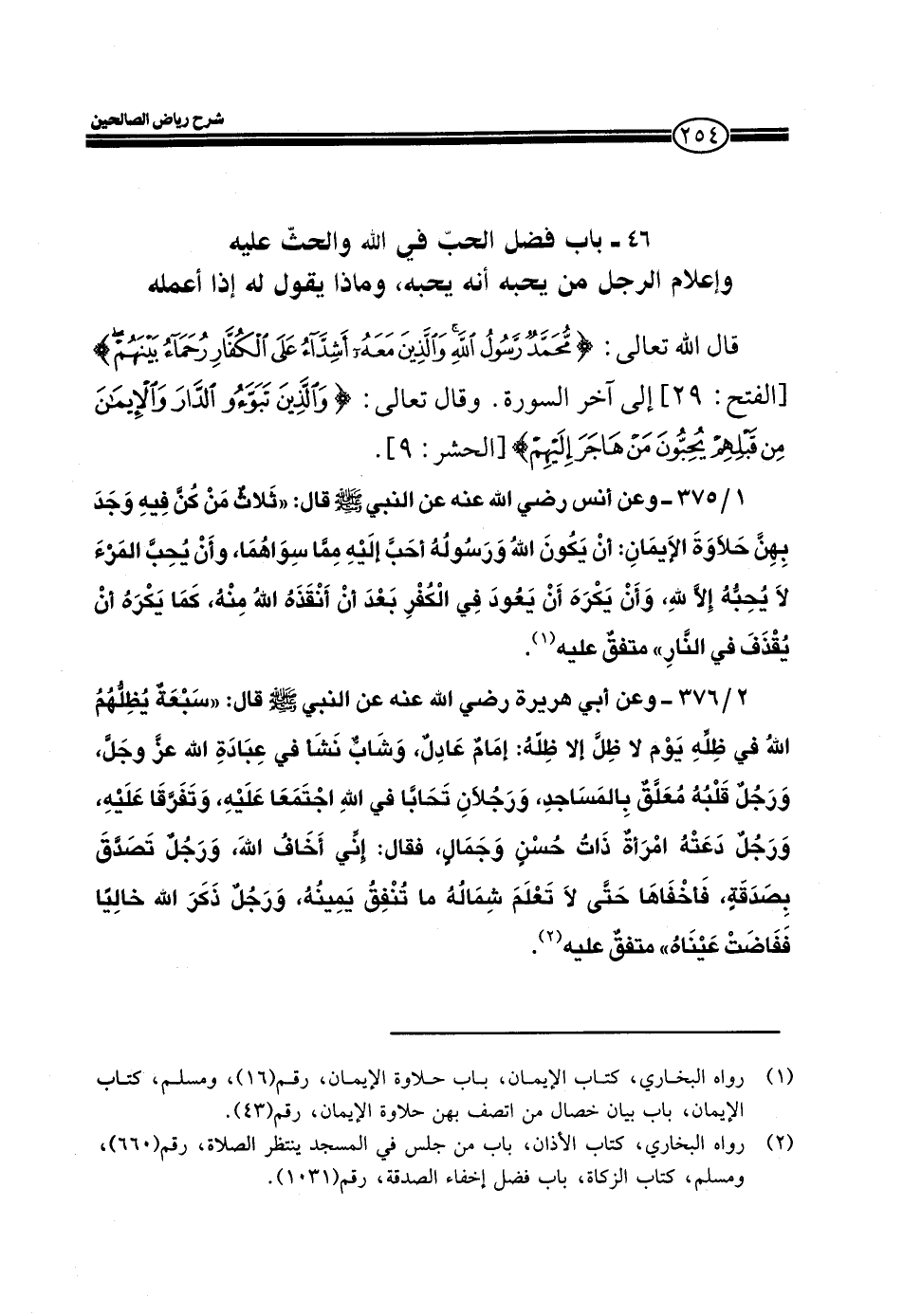 2/376 ـ وعن أبي هريرة رضي الله عنه عن النبي صلى الله عليه وسلم قال: ((سبعة يظلم الله في ظله يوم لا ظل إلا ظله: إمام عادل، وشاب نشأ في عبادة الله عز وجل، ورجل قلبه معلق بالمساجد، ورجلان تحابا في الله اجتمعا عليه، وتفرقا عليه، ورجل دعته امرأة ذات حسن وجمال، فقال: إني أخاف الله، ورجل تصدق بصدقة، فأخفاها حتى لا تعلم شماله ما تنفق يمينه، ورجل ذكر الله خالياً ففاضت عيناه)) متفق عليه.