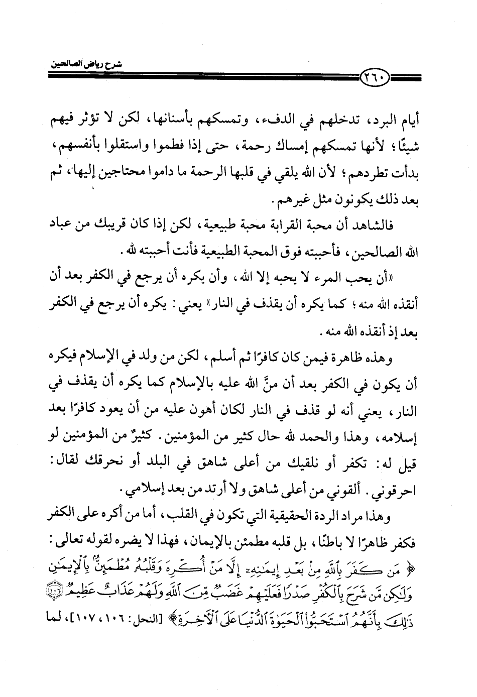 وهذا مراد الردة الحقيقية التي تكون في القلب، أما من أكره على الكفر فكفر ظاهراً لا باطناً، بل قلبه مطمئن بالإيمان، فهذا لا يضره لقوله تعالى: (مَنْ كَفَرَ بِاللَّهِ مِنْ بَعْدِ إِيمَانِهِ إِلَّا مَنْ أُكْرِهَ وَقَلْبُهُ مُطْمَئِنٌّ بِالْإيمَانِ وَلَكِنْ مَنْ شَرَحَ بِالْكُفْرِ صَدْراً فَعَلَيْهِمْ غَضَبٌ مِنَ اللَّهِ وَلَهُمْ عَذَابٌ عَظِيمٌ ذَلِكَ بِأَنَّهُمُ اسْتَحَبُّوا الْحَيَاةَ الدُّنْيَا عَلَى الْآخِرَةِ) [النحل: 106، 107] ، لما