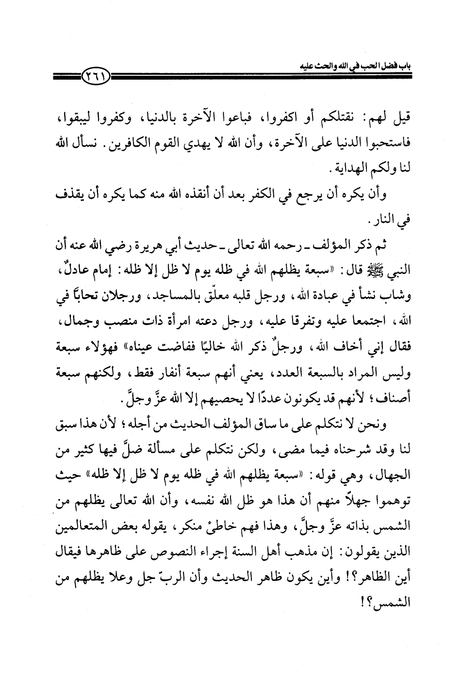 ونحن لا نتكلم على ما ساق المؤلف الحديث من أجله؛ لأن هذا سبق لنا وقد شرحناه فيما مضى، ولكن نتكلم على مسألة ضل فيها كثير من الجهال، وهي قوله: ((سبعة يظلهم الله في ظله يوم لا ظل إلا ظله)) حيث توهموا جهلاً منهم أن هذا هو ظل الله نفسه، وأن الله تعالى يظلهم من الشمس بذاته عز وجل، وهذا فهم خاطئ منكر، يقوله بعض المتعالمين الذين يقولون: إن مذهب أهل السنة إجراء النصوص على ظاهرها فيقال أين الظاهر؟! وأين يكون ظاهر الحديث وأن الرب جل وعلا يظلهم من الشمس؟!