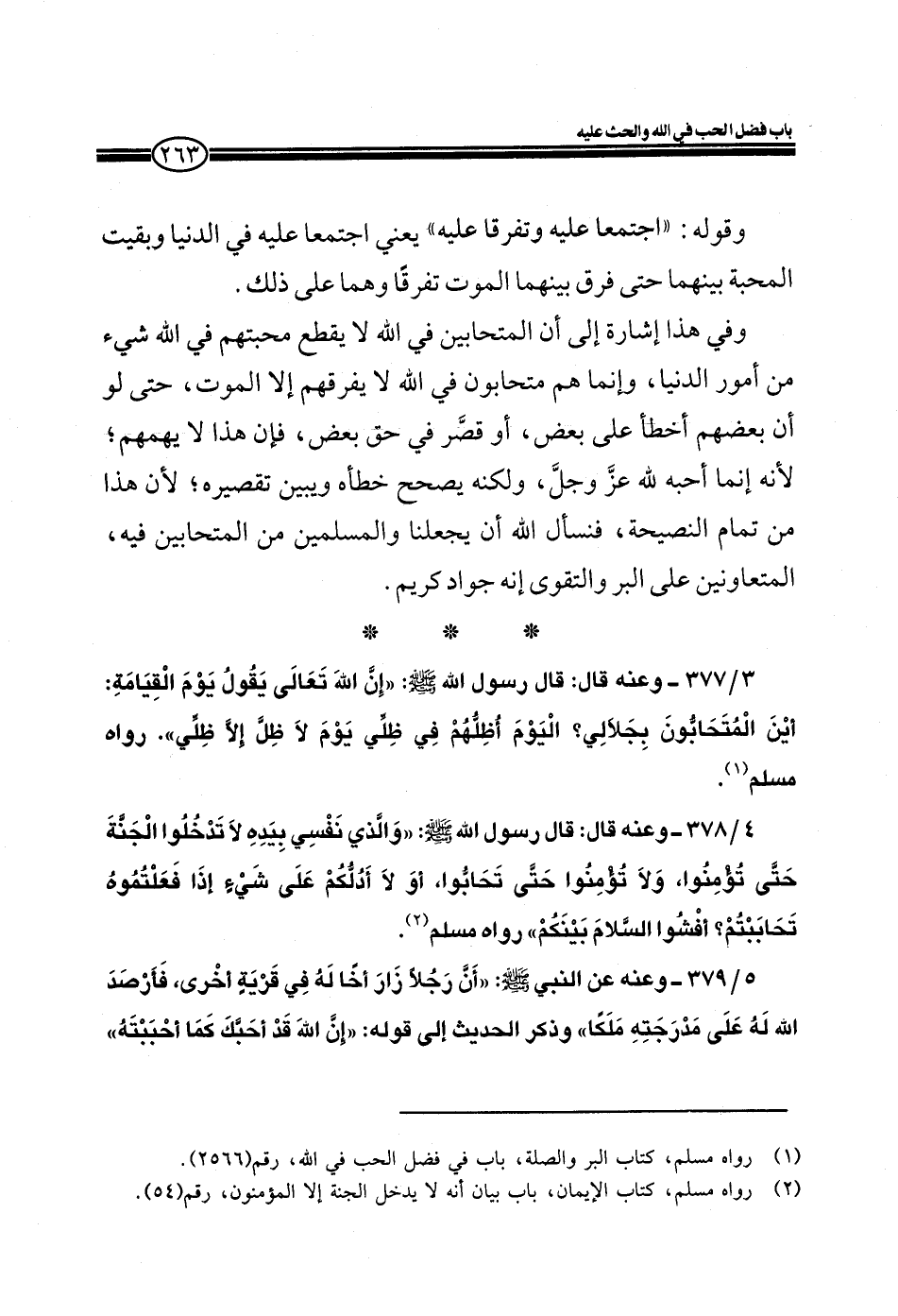 3/377 ـ وعنه قال: قال رسول الله صلى الله عليه وسلم: ((إن الله تعالى يقول يوم القيامة: أين المتحابون بجلالي؟ اليوم أظلهم في ظلي يوم لا ظل إلا ظلي)) رواه مسلم.