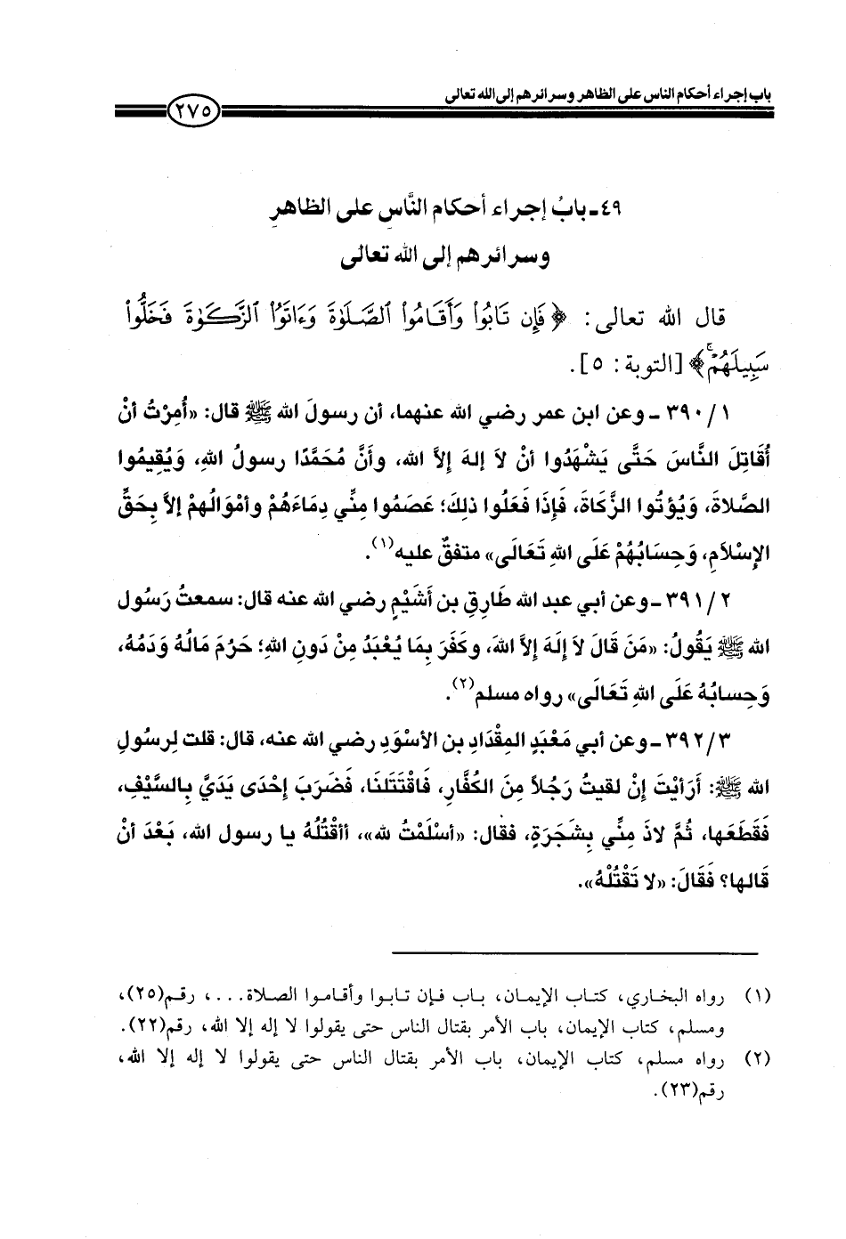 1/390 ـ وعن ابن عمر رضي الله عنهما، أن رسول الله صلى الله عليه وسلم قال: ((أمرت أن أقاتل الناس حتى يشهدوا أن لا إله إلا الله، وأن محمداً رسول الله، ويقيموا الصلاة، ويؤتوا الزكاة، فإذا فعلوا ذلك عصموا مني دماءهم وأموالهم إلا بحق الإسلام، وحسابهم على الله تعالى)) متفق عليه.