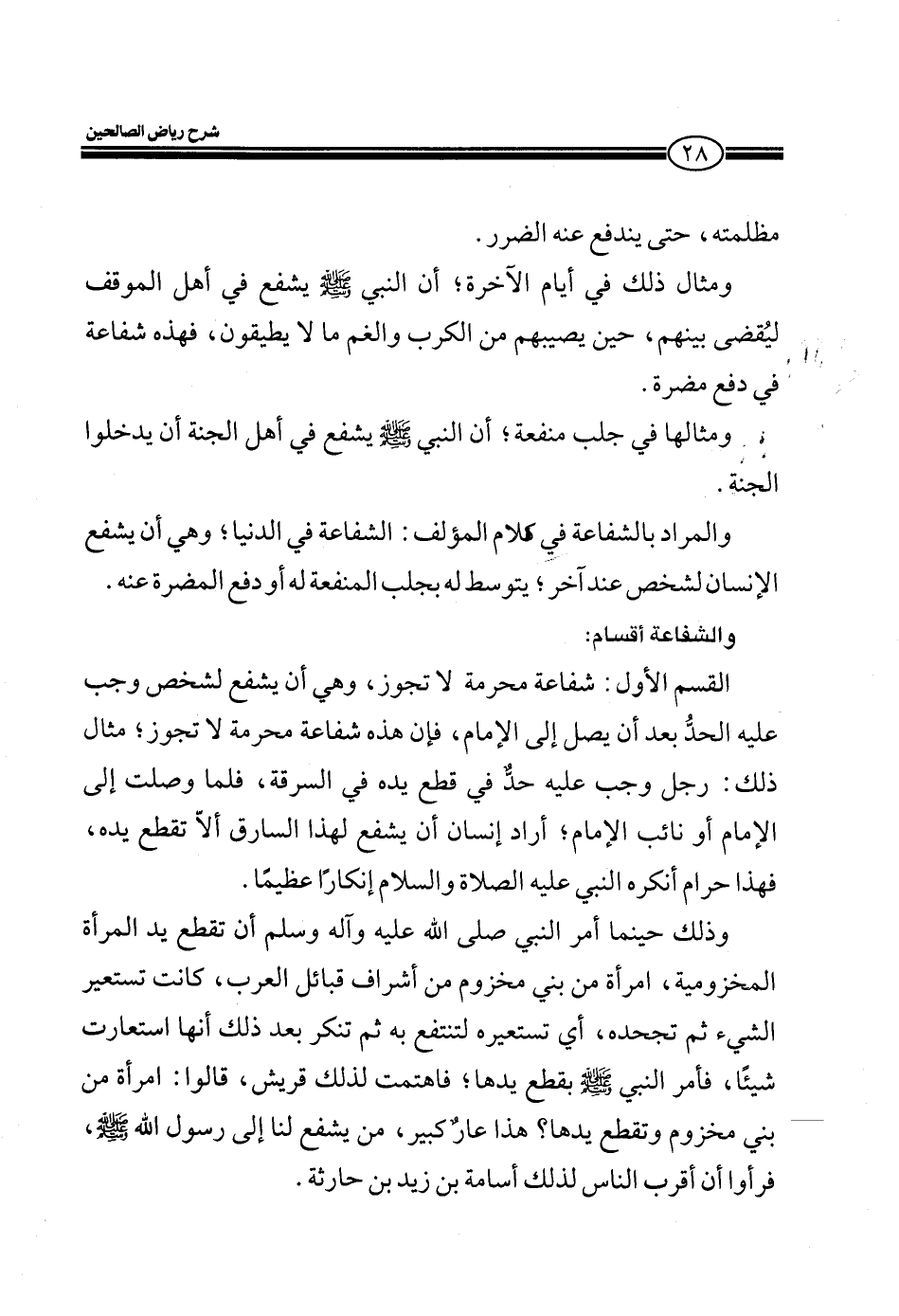 القسم الأول: شفاعة محرمة لا تجوز، وهي أن يشفع لشخص وجب عليه الحدّ بعد أن يصل إلى الإمام، فإن هذه الشفاعة محرمة لا تجوز؛ مثال ذلك: رجل وجب عليه حدّ في قطع يده في السرقة، فلما وصلت إلى الإمام أو نائب الإمام؛ أراد إنسان أن يشفع لهذا السارق ألا تقطع يده، فهذا حرام أنكره النبي عليه الصلاة والسلام إنكاراً عظيماً.