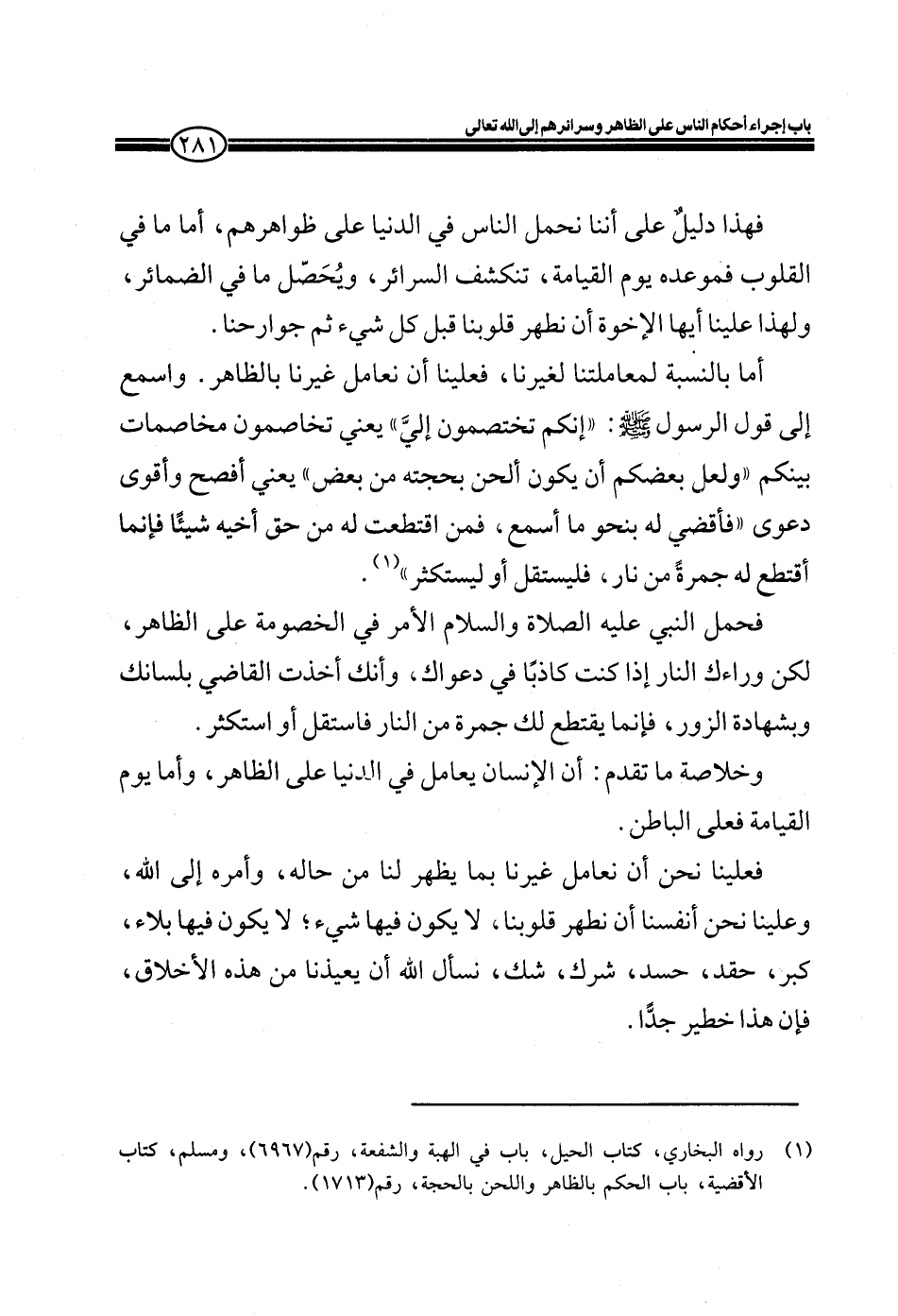 أما بالنسبة لمعاملتنا لغيرنا، فعلينا أن نعامل غيرنا بالظاهر. واسمع إلى قول الرسول صلى الله عليه وسلم: ((إنكم تختصمون إلىّ)) يعني تخاصمون مخاصمات بينكم ((ولعل يعضكم أن يكون ألحن بحجته من بعض)) يعني أفصح وأقوى دعوى ((فأقضي له بنحو ما أسمع، فمن اقتطعت له من حق أخيه شيئاً فإنما أقتطع له جمرة من نار، فليستقل أو ليستكثر)) .
