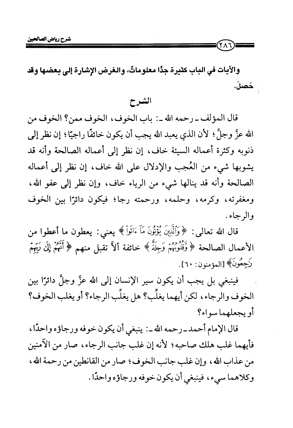 EXقال المؤلف ـ رحمه الله ـ: باب الخوف، الخوف ممن؟ الخوف من الله عز وجل؛ لأن الذي يعبد الله يجب أن يكون خائفاً راجياً؛ إن نظر إلى ذنوبه وكثرة أعماله السيئة خاف، إن نظر إلى أعماله الصالحة وأنه قد يشوبها شي من العجب والإدلال على الله خاف، إن نظر إلى عفو الله، ومغفرته، وكرمه، ورحمته رجا؛ فيكون دائراً بين الخوف والرجاء.