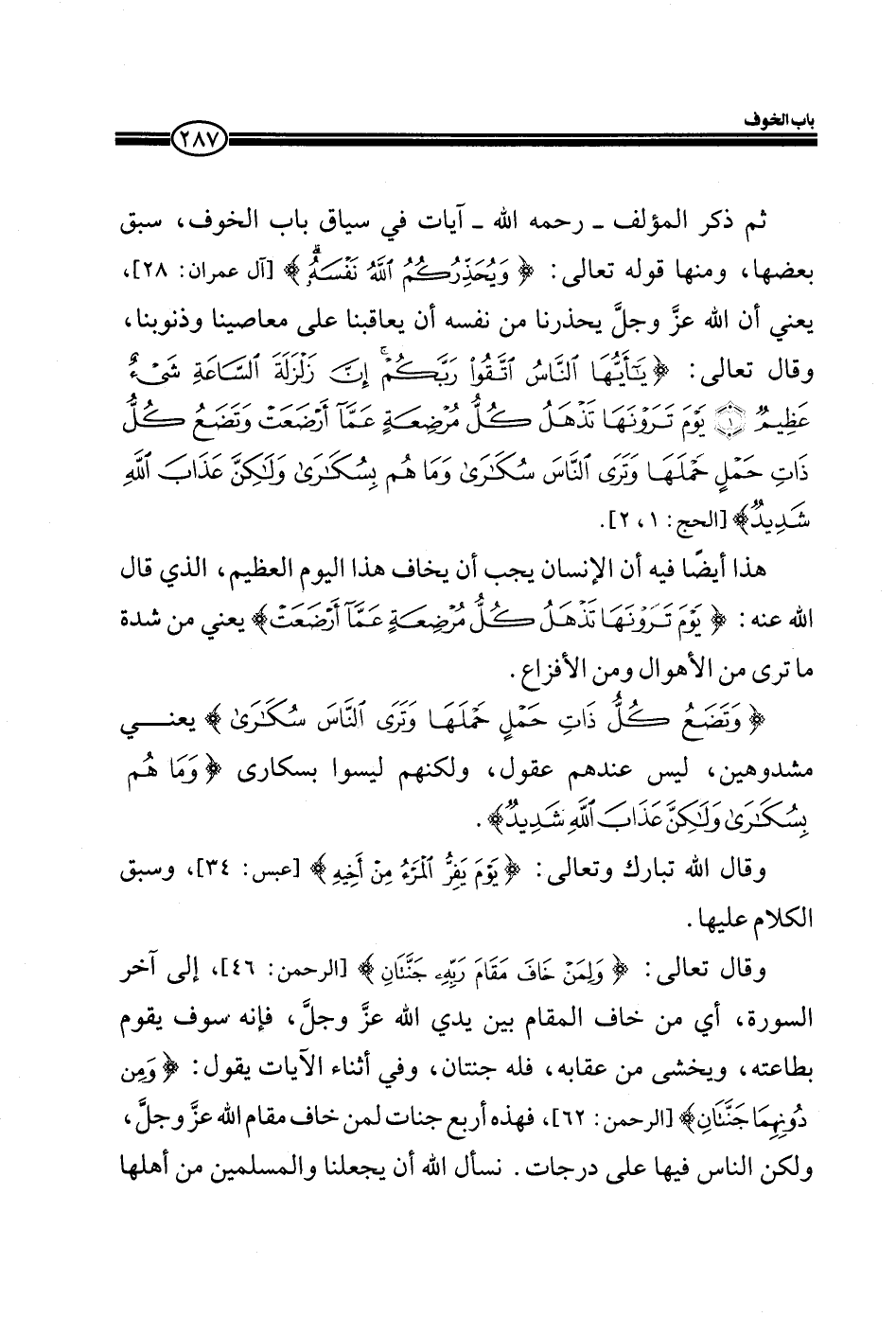 ثم ذكر المؤلف ـ رحمه الله ـ آيات في سياق باب الخوف، سبق بعضها، ومنها قوله تعالى: (وَيُحَذِّرُكُمُ اللَّهُ نَفْسَهُ) [آل عمران: 28] ، يعني أن الله عز وجل يحذرنا من نفسه أن يعاقبنا على معاصينا وذنوبنا، وقال تعالى: (يَا أَيُّهَا النَّاسُ اتَّقُوا رَبَّكُمْ إِنَّ زَلْزَلَةَ السَّاعَةِ شَيْءٌ عَظِيمٌ يَوْمَ تَرَوْنَهَا تَذْهَلُ كُلُّ مُرْضِعَةٍ عَمَّا أَرْضَعَتْ وَتَضَعُ كُلُّ ذَاتِ حَمْلٍ حَمْلَهَا وَتَرَى النَّاسَ سُكَارَى وَمَا هُمْ بِسُكَارَى وَلَكِنَّ عَذَابَ اللَّهِ شَدِيدٌ [الحج: 1، 2] .