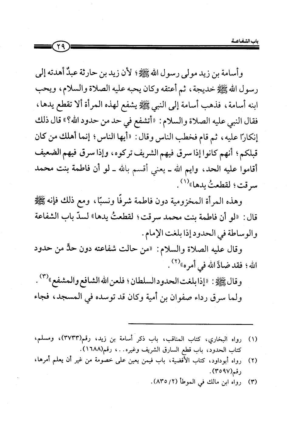 وهذه المرأة المخزومية دون فاطمة شرفاً ونسباً، ومع ذلك فإنه صلى الله عليه وسلم قال: (لو أن فاطمة بنت محمد سرقت؛ لقطعت يدها)) لسدّ باب الشفاعة والوساطة في الحدود إذا بلغت الإمام.