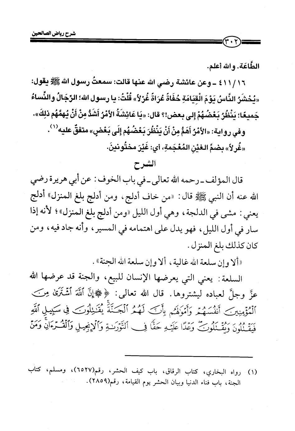 16/411 ـ وعن عائشة رضي الله عنها قالت: سمعت رسول الله صلى الله عليه وسلم يقول: ((يحشر الناس يوم القيامة حفاة عراة غرلاً)) قلت: يا رسول الله: الرجال والنساء جميعا؛ ينظر بعضهم إلى بعض!؟ قال ((يا عائشة الأمرأشد من أن يهمهم ذلك)) .