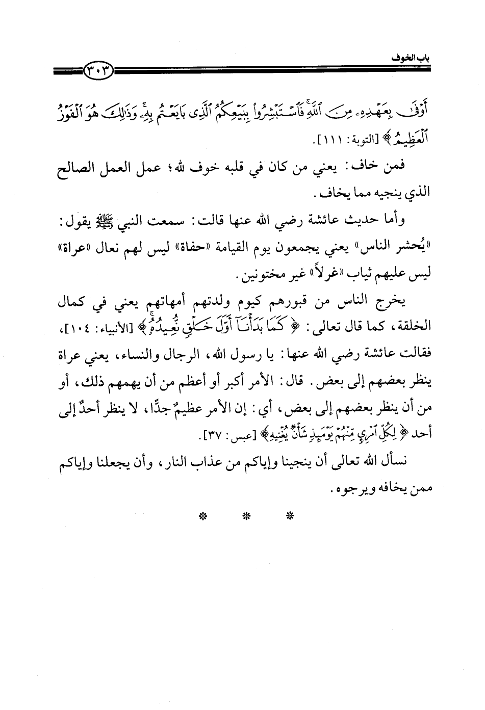 يخرج الناس من قبورهم كيوم ولدتهم أمهاتهم يعني في كمال الخلقة، كما قال تعالى: (كَمَا بَدَأْنَا أَوَّلَ خَلْقٍ نُعِيدُهُ) [الأنبياء: 104] ، فقالت عائشة رضي الله عنها: يا رسول الله، الرجال والنساء، يعني عراة ينظر بعضهم إلى بعض. قال: الأمر أكبر أو أعظم من أن يهمهم ذلك، أو من أن ينظر بعضهم إلى بعض، أي: إن الأمر عظيم جداً، لا ينظر أحد إلى أحد (لِكُلِّ امْرِئٍ مِنْهُمْ يَوْمَئِذٍ شَأْنٌ يُغْنِيهِ) [عبس: 37] .