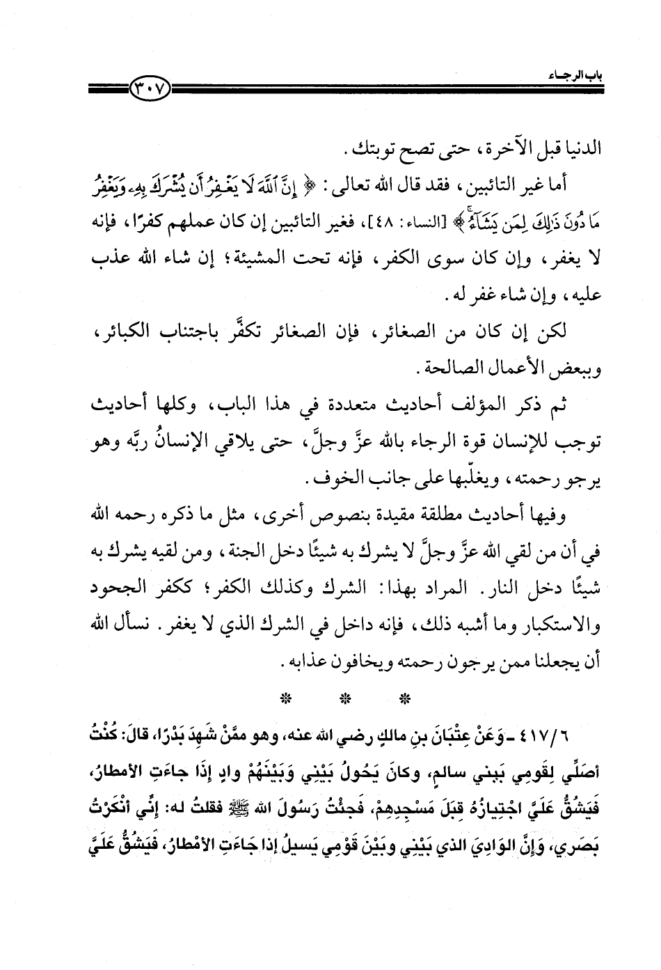 وفيها أحاديث مطلقة مقيدة بنصوص أخرى، مثل ما ذكره رحمه الله في أن من لقي الله عز وجل لا يشرك يه شيئاً دخل الجنة، ومن لقيه يشرك به شيئاً دخل النار. المراد بهذا: الشرك وكذلك الكفر؛ ككفر الجحود والاستكبار وما أشبه ذلك، فإنه داخل في الشرك الذي لا يغفر. نسأل الله أن يجعلنا ممن يرجو رحمته ويخافون عذابه.
