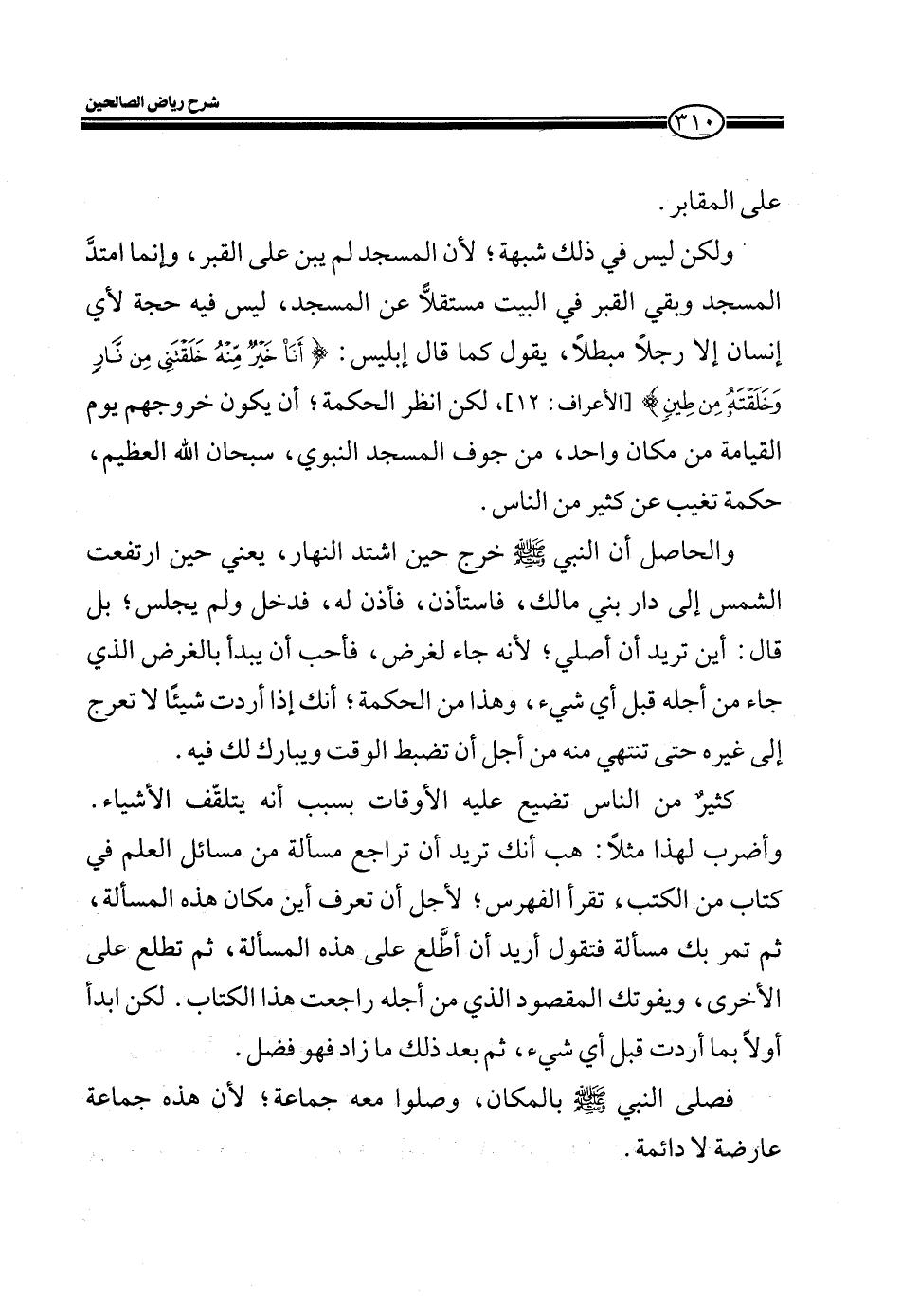 ولكن ليس في ذلك شبهة؛ لأن المسجد لم يبن على القبر، وإنما امتد المسجد وبقي القبر في البيت مستقلاً عن المسجد، ليس فيه حجة لآي إنسان إلا رجلاً مبطلاً، يقول كما قال إبليس: (أَنَا خَيْرٌ مِنْهُ خَلَقْتَنِي مِنْ نَارٍ وَخَلَقْتَهُ مِنْ طِينٍ) [االأعراف: 12] ، لكن انظر الحكمة؛ أن يكون خروجهم يوم القيامة من مكان واحد، من جوف المسجد النبوي، سبحان الله العظيم، حكمة تغيب عن كثير من الناس.