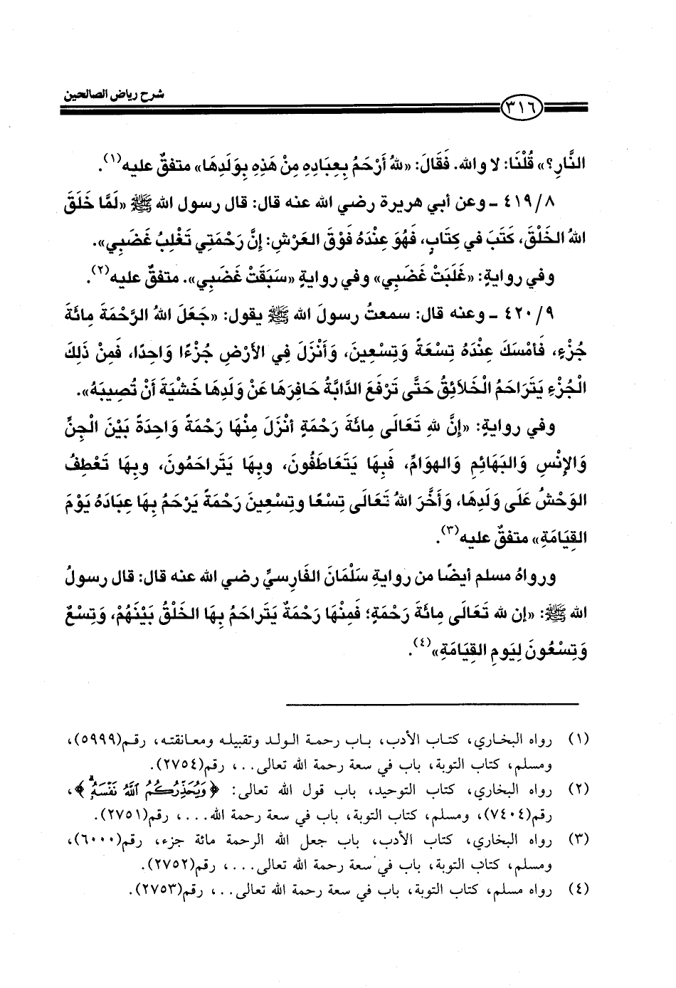 9/420 ـ وعنه قال: سمعت رسول الله صلى الله عليه وسلم يقول: ((جعل الله الرحمة مائة جزء، فأمسك عنده تسعة وتسعين، وأنزل في الأرض جزءاً واحداً فمن ذلك الجزء يتراحم الخلائق حتى ترفع الدابة حافرها عن ولدها خشية أن تصيبه)) .