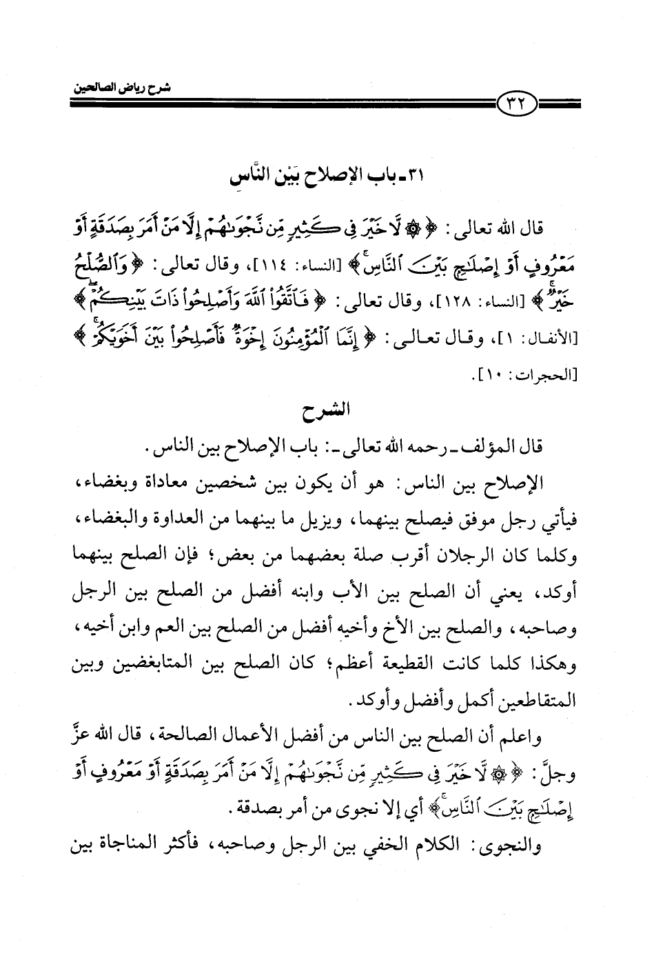 واعلم أن الصلح بين الناس من أفضل الأعمال الصالحة، قال الله عزَّ وجلَّ (لا خَيْرَ فِي كَثِيرٍ مِنْ نَجْوَاهُمْ إِلَّا مَنْ أَمَرَ بِصَدَقَةٍ أَوْ مَعْرُوفٍ أَوْ إِصْلاحٍ بَيْنَ النَّاسِ) أي إلا نجوى من أمر بصدقة.