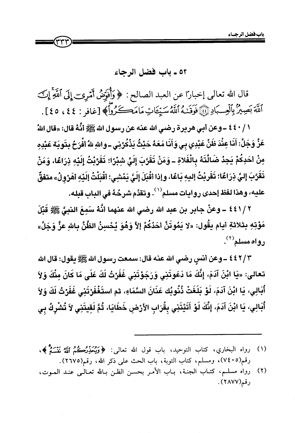 2/441 ـ وعن جابر بن عبد الله رضي الله عنهما أنه سمع النبي صلى الله عليه وسلم قبل موته بثلاثة أيام يقول: ((لا يموتن أحدكم إلا وهو يحسن الظن بالله عز وجل)) رواه مسلم.