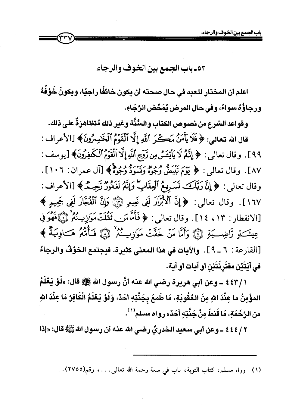 قال الله تعالى: (فَلا يَأْمَنُ مَكْرَ اللَّهِ إِلَّا الْقَوْمُ الْخَاسِرُونَ) [االأعراف: 99] . وقال تعالى: (إِنَّهُ لا يَايْئسُ مِنْ رَوْحِ اللَّهِ إِلَّا الْقَوْمُ الْكَافِرُونَ) [يوسف: 87] . وقال تعالى: (يَوْمَ تَبْيَضُّ وُجُوهٌ وَتَسْوَدُّ وُجُوهٌ) [آل عمران: 106] وقال تعالى: (إِنَّ رَبَّكَ لَسَرِيعُ الْعِقَابِ وَإِنَّهُ لَغَفُورٌ رَحِيمٌ) [الأعراف: 167] . وقال تعالى: (إِنَّ الْأَبْرَارَ لَفِي نَعِيمٍ) وَإِنَّ الْفُجَّارَ لَفِي جَحِيمٍ) [الانفطار: 13، 14] . وقال تعالى: (فَأَمَّا مَنْ ثَقُلَتْ مَوَازِينُهُ فَهُوَ فِي عِيشَةٍ رَاضِيَةٍ وَأَمَّا مَنْ خَفَّتْ مَوَازِينُهُ فَأُمُّهُ هَاوِيَةٌ) [القارعة: 6، 9] . والآيات في هذا المعني كثيرة. فيجتمع الخوف والرجاء في آيتين مقترنتين أو آيات أو آية.