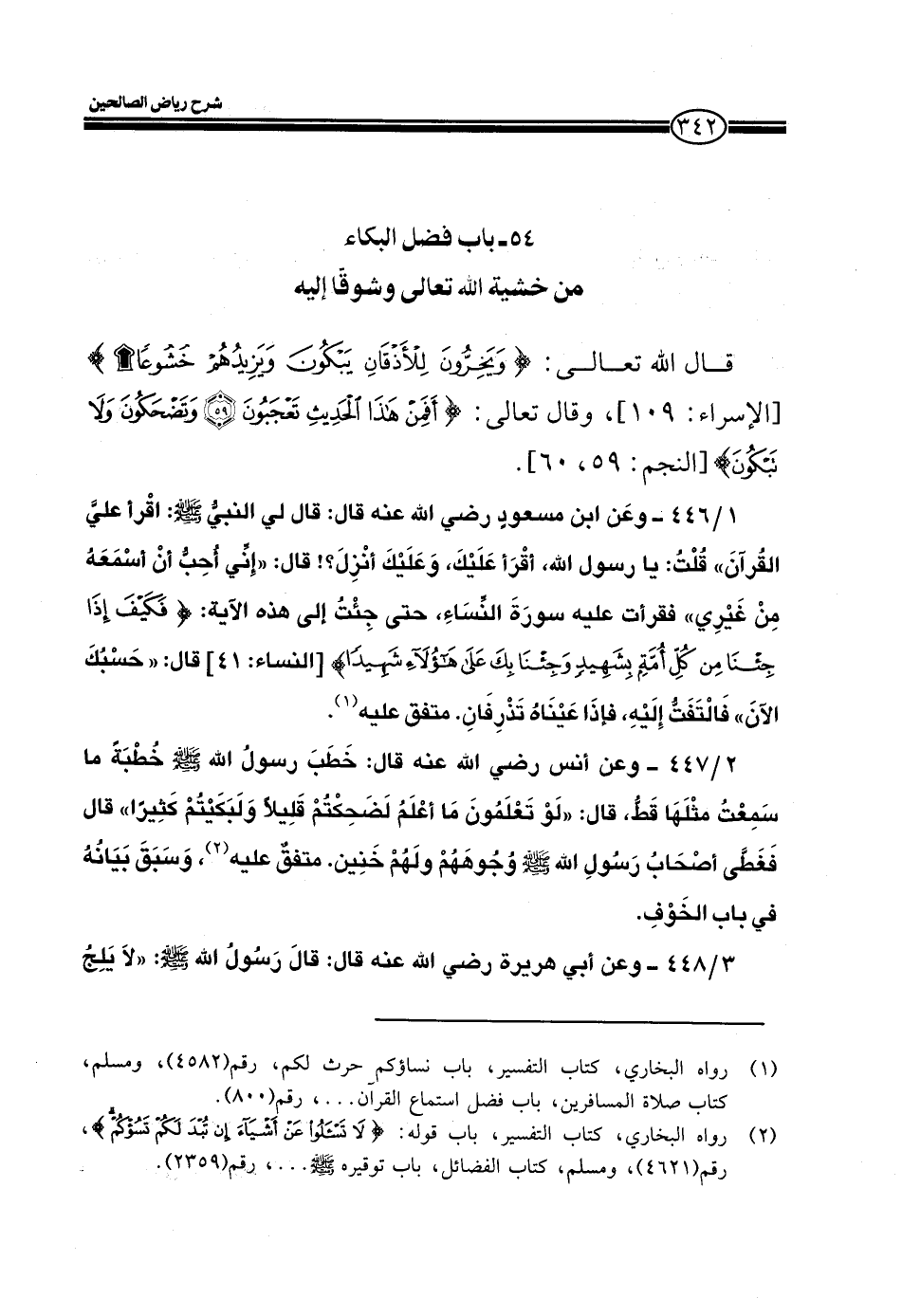 1/446 ـ وعن ابن مسعود رضي الله عنه قال: قال لي النبي صلى الله عليه وسلم: اقرأ علي القرآن)) قلت: يا رسول الله أقرأ عليك، وعليك أنزل؟ ! قال: ((إني أحب أن أسمعه من غيري)) فقرأت عليه سورة النساء، حتى جئت إلى هذه الآية: (فَكَيْفَ إِذَا جِئْنَا مِنْ كُلِّ أُمَّةٍ بِشَهِيدٍ وَجِئْنَا بِكَ عَلَى هَؤُلاءِ شَهِيداً) [النساء: 41] قال: ((حسبك الآن)) فالتفت إليه، فإذا عيناه تذرفان. متفق عليه.