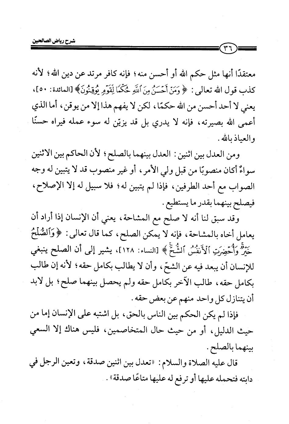 ومن العدل بين اثنين: العدل بينهما بالصلح، لأن الحاكم بين الاثنين سواء أكان منصوباً من قبل ولي الآمر، أو غير منصوب قد لا يتبين له وجه الصواب مع أحد الطرفين، فإذا لم يتبين له، فلا سبيل له إلا الإصلاح، فيصلح بينهما بقدر ما يستطيع.