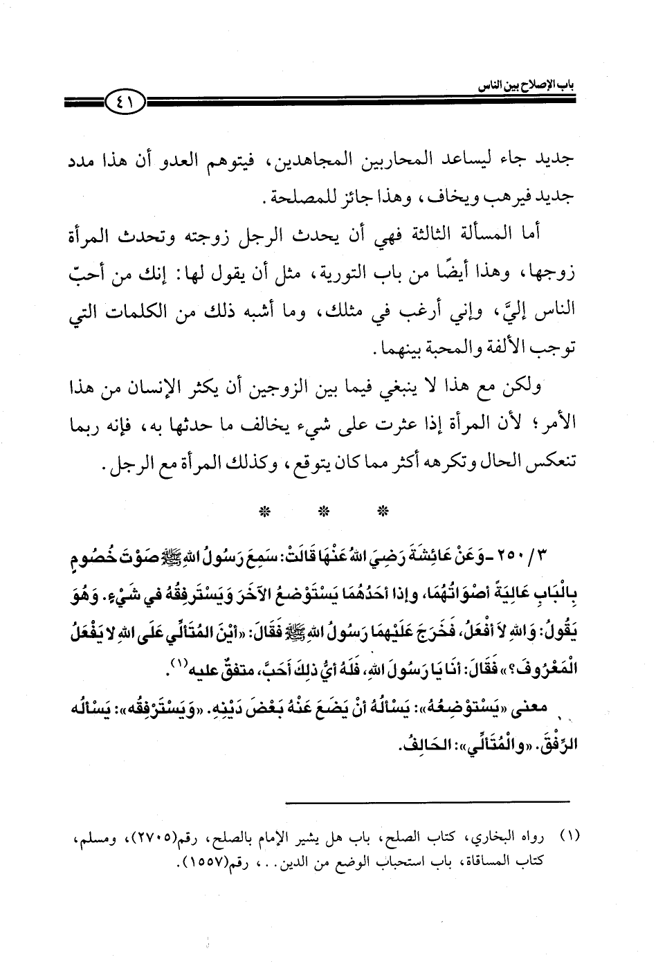 3/250 ـ وعن عائشة رضي الله عنها قالت: سمع رسول الله صلى الله عليه وسلم صوت خصوم بالباب عالية أصواتهما، وإذا أحدهما يستوضع الآخر ويسترفقه في شيء، وهو يقول: والله لا أفعل، فخرج عليهما رسول الله صلى الله عليه وسلم فقال: ((أين المتألي على الله لا يفعل المعروف؟)) فقال أنا يا رسول الله فله أي ذلك أحب) ، متفق عليه.