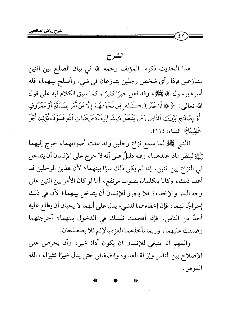 EXهذا الحديث ذكره المؤلف رحمه الله في بيان الصلح بين اثنين متنازعين فإذا رأى شخص رجلين يتنازعان في شيء وأصلح بينهما، فله أسوة برسول الله صلى الله عليه وسلم، وقد فعل خيراً كثيراً، كما سبق الكلام فيه على قول الله تعالى: (لا خَيْرَ فِي كَثِيرٍ مِنْ نَجْوَاهُمْ إِلَّا مَنْ أَمَرَ بِصَدَقَةٍ أَوْ مَعْرُوفٍ أَوْ إِصْلاحٍ بَيْنَ النَّاسِ وَمَنْ يَفْعَلْ ذَلِكَ ابْتِغَاءَ مَرْضَاتِ اللَّهِ فَسَوْفَ نُؤْتِيهِ أَجْراً عَظِيماً) [النساء: 114] .