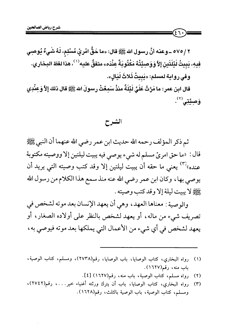 2/575- وعنه أن رسول الله صلى الله عليه وسلم قال: ((ما حق امرئ مسلم، له شيء يُوصى فيه، يبيتُ ليلتين إلا ووصيتهُ مكتوبة عنده)) متفق عليه، هذا لفظ البخاري.